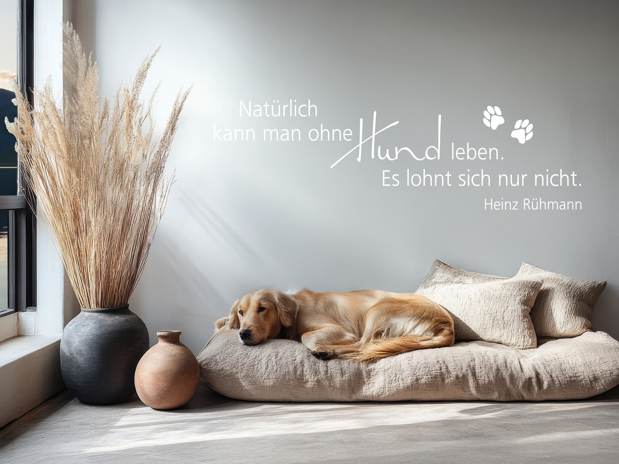 Ein bekanntes Zitat von Heinz Rühmann über den besten Freund des Menschen spricht wohl vielen Hundebesitzern aus der Seele: Ein Leben ohne Hund wäre wohl für die Meisten unvorstellbar. Bringen Sie dies mit unserem einzigartigen Wandtattoo zum Ausdruck und werten Sie gleichzeitig Ihren Eingangsbereich auf. Aber auch in anderen Räumen, z.B. im Wohnzimmer über einer Kommode ist dieses Wandzitat ein wunderschöner Akzent, der Ihrem Heim mit Sicherheit an Individualität verleiht.