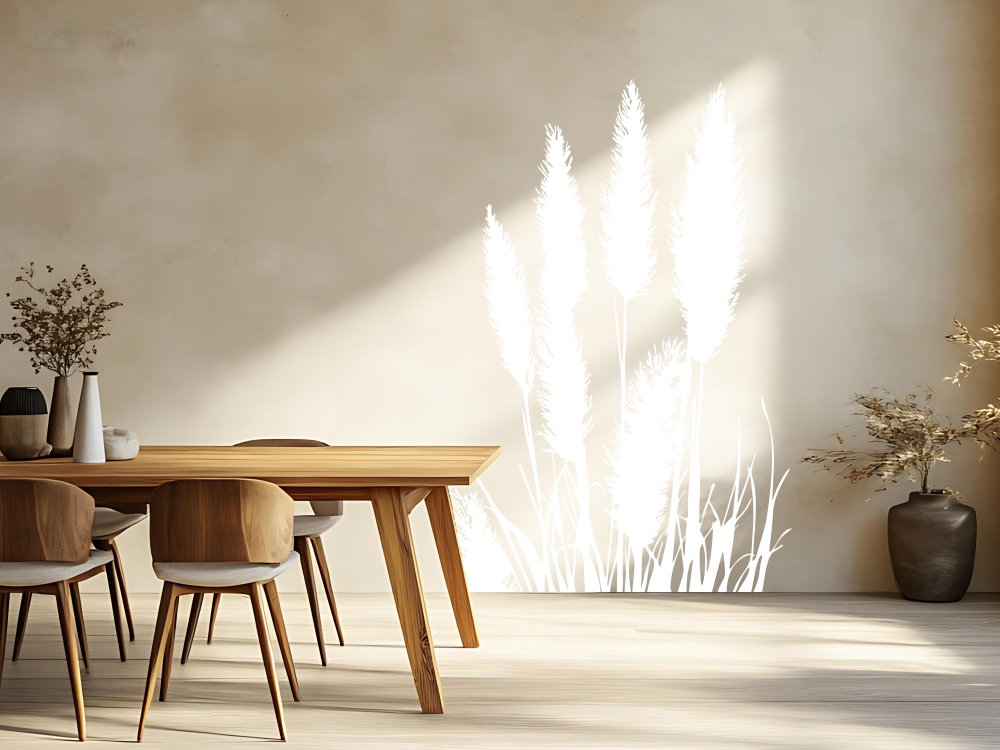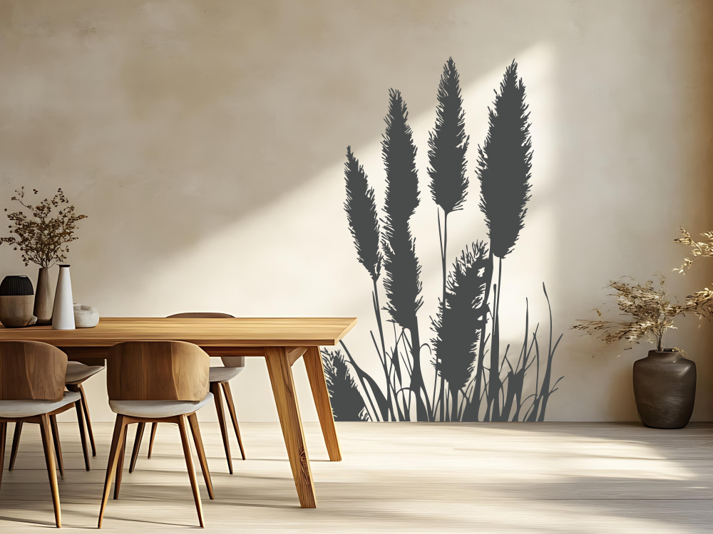 Das Pampasgras ist eine beliebte Pflanze und wird besonders gerne in der modernen Gartengestaltung eingesetzt. Es verbreitet mediterranes Flair, verschafft Wohlfühlatmosphäre und sorgt für einen Hauch Urlaub in Ihrem Garten. Diese dekorative Pflanze, in der Fachsparache auch Cortaderia selloana genannt, liebt warme Standorte und volle Sonne. Leider erfüllt nicht jede Region diese Ansprüche – und somit müssen manche Gärten auf diese immergrüne Pflanze verzichten. Um sich jedoch ganz unabhängig von Ort und Lage Ihres Gartens an einem Pampasgras erfreuen zu dürfen, erhalten Sie bei uns das Wandtattoo Pampasgras zur floralen Gestaltung Ihrer Wände – wann und wo immer sie wollen. Für den Innenraum aus einer seidenmatten Wandtattoo-Folie, als Glastattoo oder Sichtschutz aus einer edlen Milchglasfolie – ganz nach Ihren persönlichen Bedürfnissen. Zur individuellen Wandgestaltung erhalten Sie bei uns eine große Auswahl an unterschiedlichen Farben und Größen. Wünschen Sie den Pampasgrad Aufkleber zur Glasgestaltung, bestellen Sie bitte unsere edle Glasdekorfolie. Diese können Sie in jedem Objekt in der Farbauswahl bestimmen.