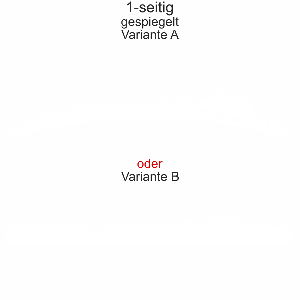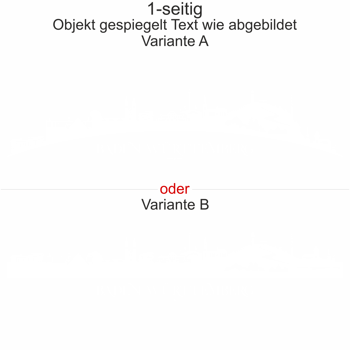 Unsere Autoaufkleber sind ein- und zweiseitig erhältlich. Wenn Sie ein Motiv nur einseitig wünschen, haben Sie die Möglichkeit, wie abgebildet oder gespiegelt und (Objekt gespiegelt Text wie abgebildet) zu wählen. Wenn Sie den Autoaufkleber zweiseitig wünschen, müssen Sie in dem Auswahlfeld Größe die entsprechende Größe 2-seitig auswählen. Sie erhalten dann Ihren Aufkleber einmal wie abgebildet und einmal Objekt gespiegelt Text wie abgebildet.