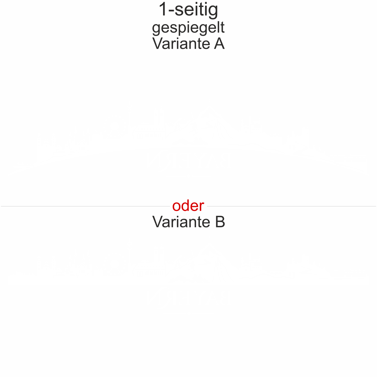 Unsere Autoaufkleber sind ein- und zweiseitig erhältlich. Wenn Sie ein Motiv nur einseitig wünschen, haben Sie die Möglichkeit, wie abgebildet oder gespiegelt und (Objekt gespiegelt Text wie abgebildet) zu wählen. Wenn Sie den Autoaufkleber zweiseitig wünschen, müssen Sie in dem Auswahlfeld Größe die entsprechende Größe 2-seitig auswählen. Sie erhalten dann Ihren Aufkleber einmal wie abgebildet und einmal Objekt gespiegelt Text wie abgebildet.