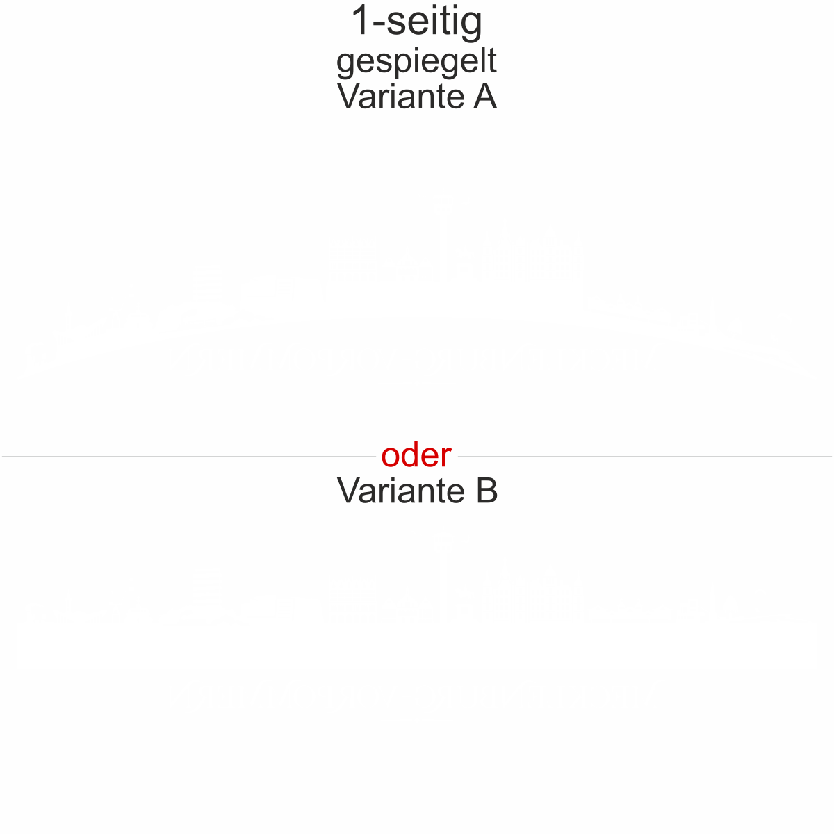 Unsere Autoaufkleber sind ein- und zweiseitig erhältlich. Wenn Sie ein Motiv nur einseitig wünschen, haben Sie die Möglichkeit, wie abgebildet oder gespiegelt und (Objekt gespiegelt Text wie abgebildet) zu wählen. Wenn Sie den Autoaufkleber zweiseitig wünschen, müssen Sie in dem Auswahlfeld Größe die entsprechende Größe 2-seitig auswählen. Sie erhalten dann Ihren Aufkleber einmal wie abgebildet und einmal Objekt gespiegelt Text wie abgebildet.