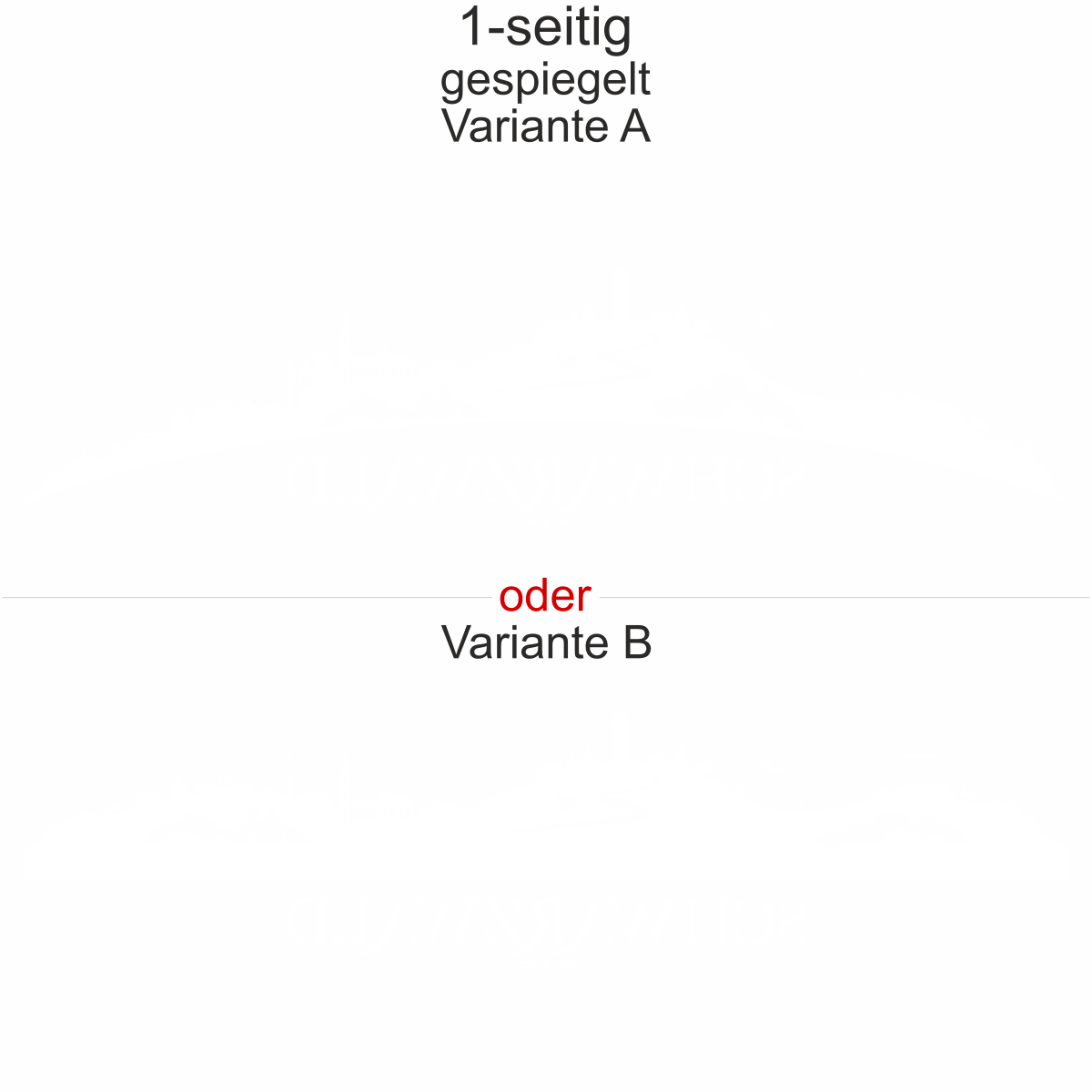 Unsere Autoaufkleber sind ein- und zweiseitig erhältlich. Wenn Sie ein Motiv nur einseitig wünschen, haben Sie die Möglichkeit, wie abgebildet oder gespiegelt und (Objekt gespiegelt Text wie abgebildet) zu wählen. Wenn Sie den Autoaufkleber zweiseitig wünschen, müssen Sie in dem Auswahlfeld Größe die entsprechende Größe 2-seitig auswählen. Sie erhalten dann Ihren Aufkleber einmal wie abgebildet und einmal Objekt gespiegelt Text wie abgebildet.