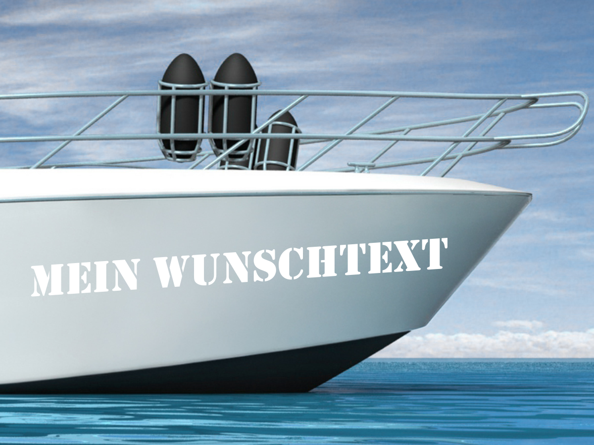 Bei diesem tollen und hochwertigen Aufkleber für Ihr Boot haben Sie die Möglichkeit, Ihren eigenen Text einzugeben. Schaffen Sie sich einen Bootsaufkleber ganz nach Ihrem Geschmack. Alle Texte sind konturgeschnitten und ohne transparenten Hintergrund. Wir bieten eine große Auswahl an Farben.