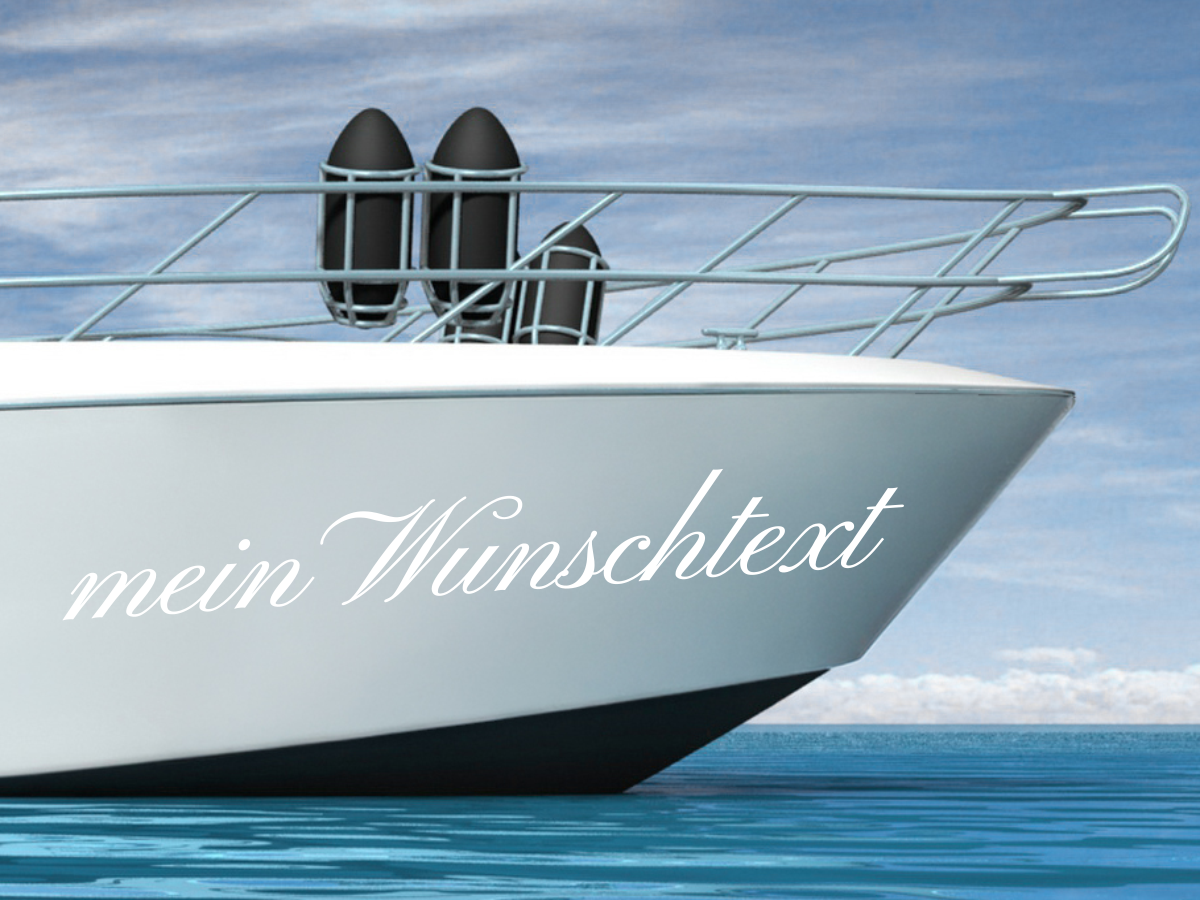 Bei diesem tollen und hochwertigen Aufkleber für Ihr Boot haben Sie die Möglichkeit, Ihren eigenen Text einzugeben. Schaffen Sie sich einen Bootsaufkleber ganz nach Ihrem Geschmack. Alle Texte sind konturgeschnitten und ohne transparenten Hintergrund. Wir bieten eine große Auswahl an Farben.