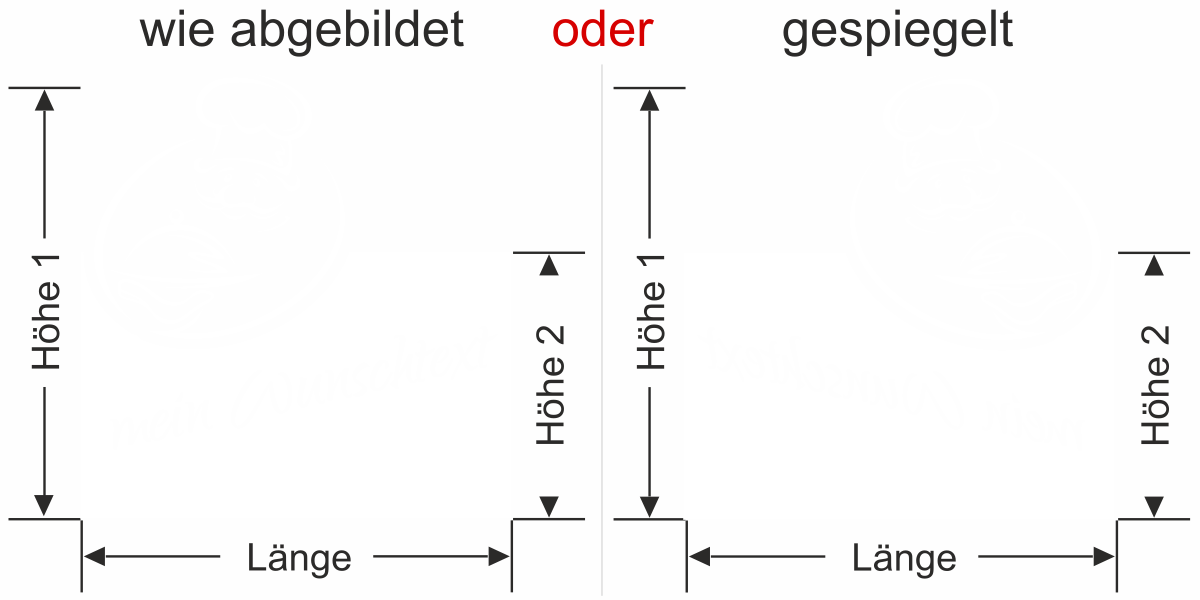 Objekt gespiegelt, Text wie abgebildet = Motiv/Text von außen geklebt und von außen lesbar, jedoch Motiv auf der anderen Seite
