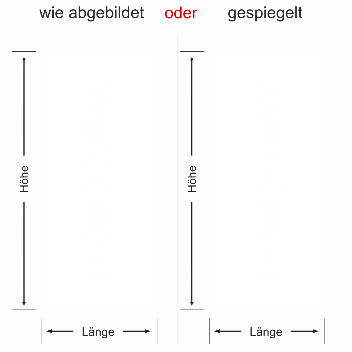 Objekt gespiegelt, Text wie abgebildet = Motiv/Text von außen geklebt und von außen lesbar, jedoch Motiv auf der anderen Seite