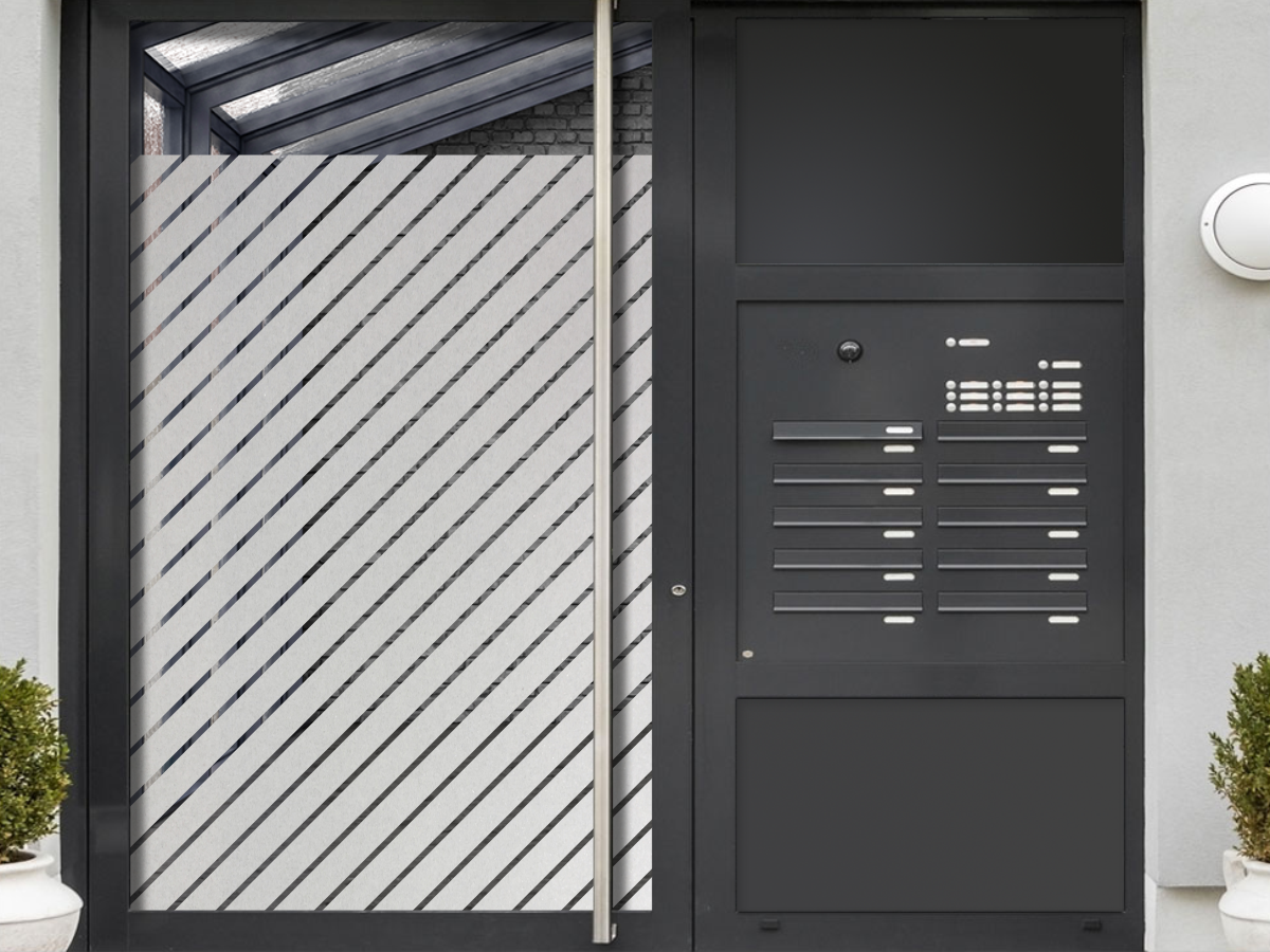 Sichtschutz Fensterfolie mit ca. 5 cm breiten schrägen Streifen und ca. 1 cm Abstand dazwischen