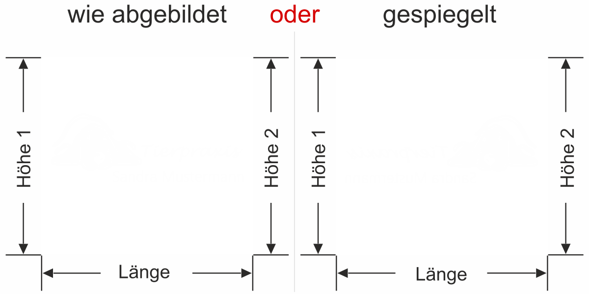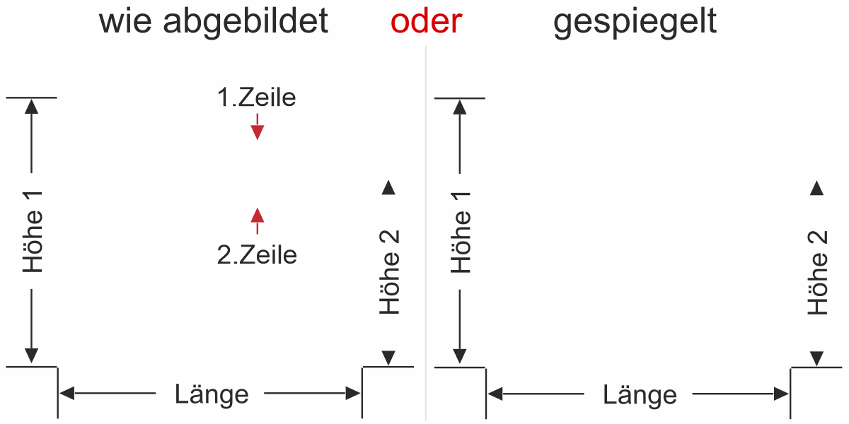 Objekt gespiegelt, Text wie abgebildet = Motiv/Text von außen geklebt und von außen lesbar, jedoch Motiv auf der anderen Seite