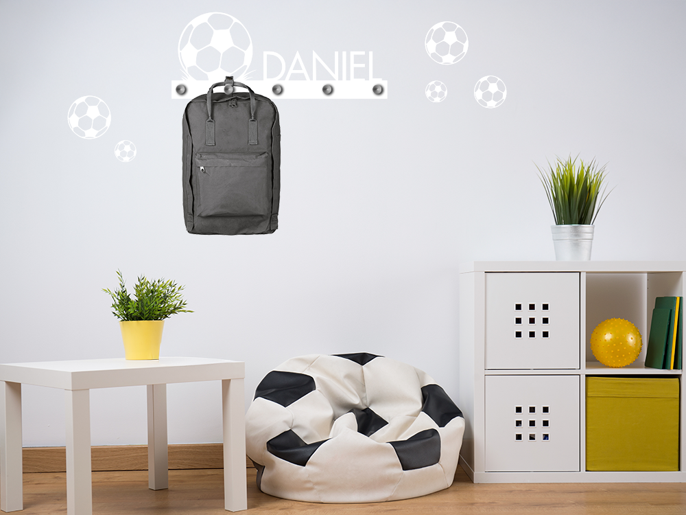 Fußball zählt zu den beliebtesten Sportarten und trifft schon bei den Kleinen auf große Begeisterung. Für alle Fußball Liebhaber wurde deshalb dieses Wandmotiv entworfen – die Anordnung der Fußbälle kann frei gewählt werden, wodurch eine völlig individuelle Wandgestaltung entsteht. Der frei einzugebende Kindesname erhöht dabei den Individalitätsfaktor noch einmal. Die optional dazu bestellbaren Wandhaken sind ungemein praktisch, denn dadurch entsteht ein neuer Stauplatz für beispielsweise Kleidungsstücke und Rucksäcke. Garantiert werden die Kinderaugen beim täglichen Anblick dieses tollen Designs leuchten. Es bedarf keines großen zeitlichen Aufwandes um das Wandtattoo an der Wand anzubringen und es bei Bedarf wieder zu entfernen.