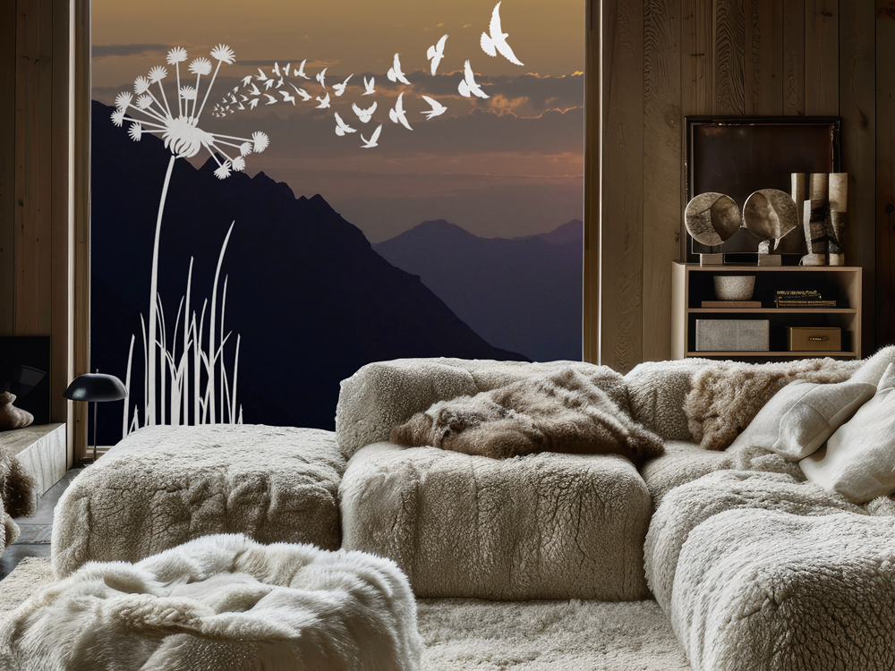 Ein Glasaufkleber mit Pusteblume und Vögel für Ihre Ruheoase