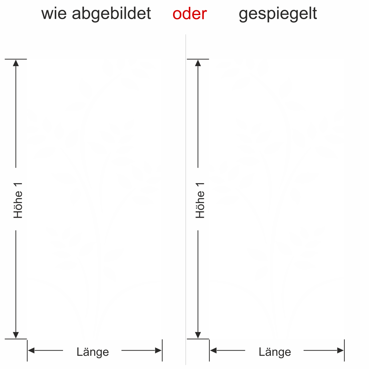 Objekt gespiegelt, Text wie abgebildet = Motiv/Text von außen geklebt und von außen lesbar, jedoch Motiv auf der anderen Seite