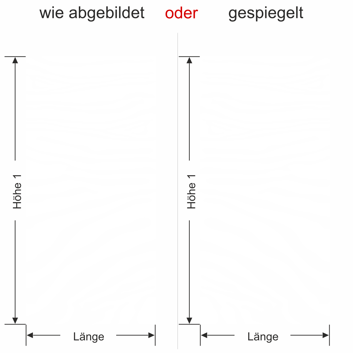 Objekt gespiegelt, Text wie abgebildet = Motiv/Text von außen geklebt und von außen lesbar, jedoch Motiv auf der anderen Seite