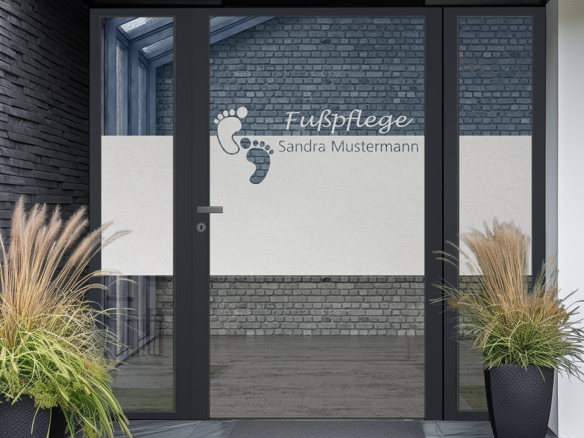Die medizinische Fusspflege ist oftmals verkannt, hat sie doch immense Bedeutung auf die Gesundheit eines Menschen. Tragen Sie Ihren Stolz nach außen und zeigen Sie, an welchen Profi sich Menschen wenden können, die von einer professionellen Fußpflege profitieren möchten. Das Motiv der Fußabdrücke weist auch optisch auf Ihren Geschäftsbereich hin. Und das Beste: Sie können die Sichtschutzfolie individualisieren, indem Sie Ihren Namen ins Motiv einarbeiten lassen. Jeder Kunde weiß sofort, wer hier der Ansprechpartner ist. Zudem hält die Folie neugierige Blicke effektiv fern, ohne aber den Salon komplett abzudunkeln.