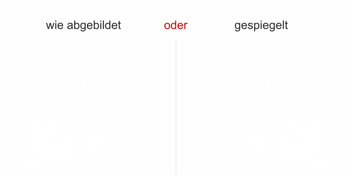 Objekt gespiegelt, Text wie abgebildet = Motiv/Text von außen geklebt und von außen lesbar, jedoch Motiv auf der anderen Seite