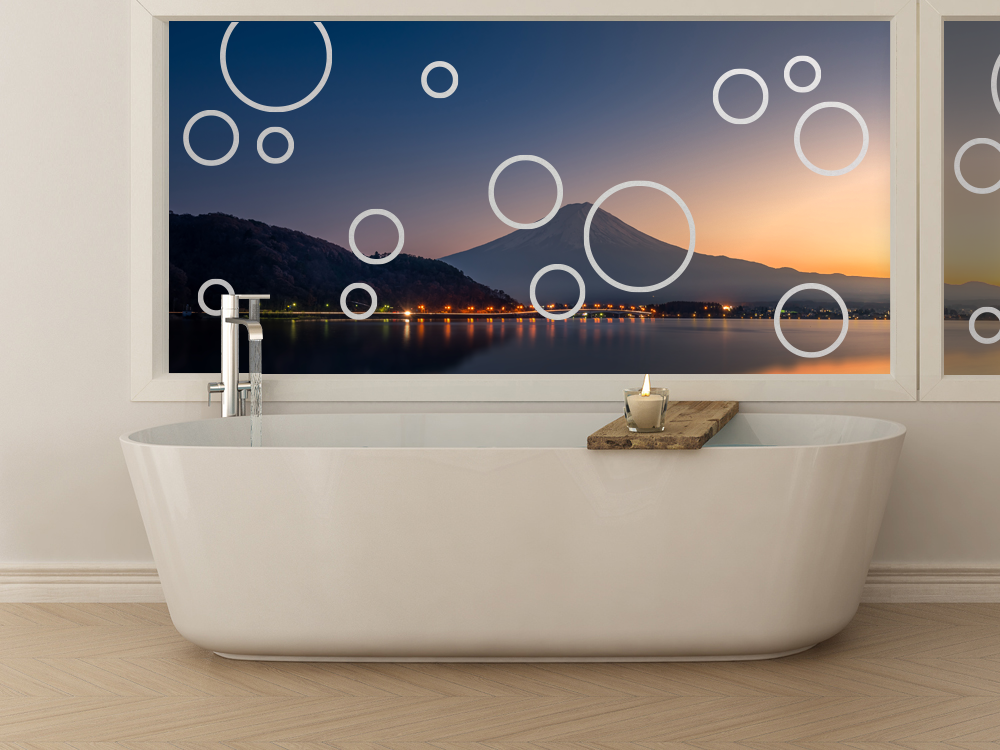 Diese satinierte Folie für Glas mit Kreisen im Set ist eine tolle Möglichkeit, um schlichte Glasflächen aufzupeppen. Völlig ohne Schnörkel kommt das Motiv aus, das auf Fensterscheiben, Glastüren oder gläsernen Fronten eingesetzt werden kann. Keinen Hingucker holen Sie sich mit diesem Fenstertattoo ins Haus, sondern vielmehr ein Dekoelement, dass das komplette Ambiente eines Raumes aufwertet. Obwohl die Kreise häufig im Bad eingesetzt werden, da sie mit Wasserblasen assoziiert werden, können Sie die Glasdekorfolie auch im Flur oder dem Schlafzimmer verwenden. Auch dort schafft es eine gemütliche Stimmung.