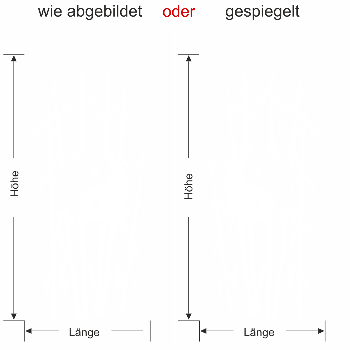 Objekt gespiegelt, Text wie abgebildet = Motiv/Text von außen geklebt und von außen lesbar, jedoch Motiv auf der anderen Seite