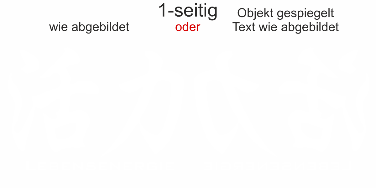 Objekt gespiegelt, Text wie abgebildet = Motiv/Text von außen geklebt und von außen lesbar, jedoch Motiv auf der anderen Seite