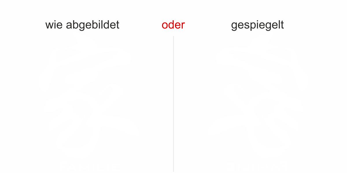 Objekt gespiegelt, Text wie abgebildet = Motiv/Text von außen geklebt und von außen lesbar, jedoch Motiv auf der anderen Seite