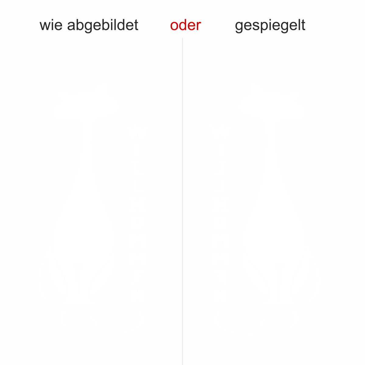Objekt gespiegelt, Text wie abgebildet = Motiv/Text von außen geklebt und von außen lesbar, jedoch Motiv auf der anderen Seite