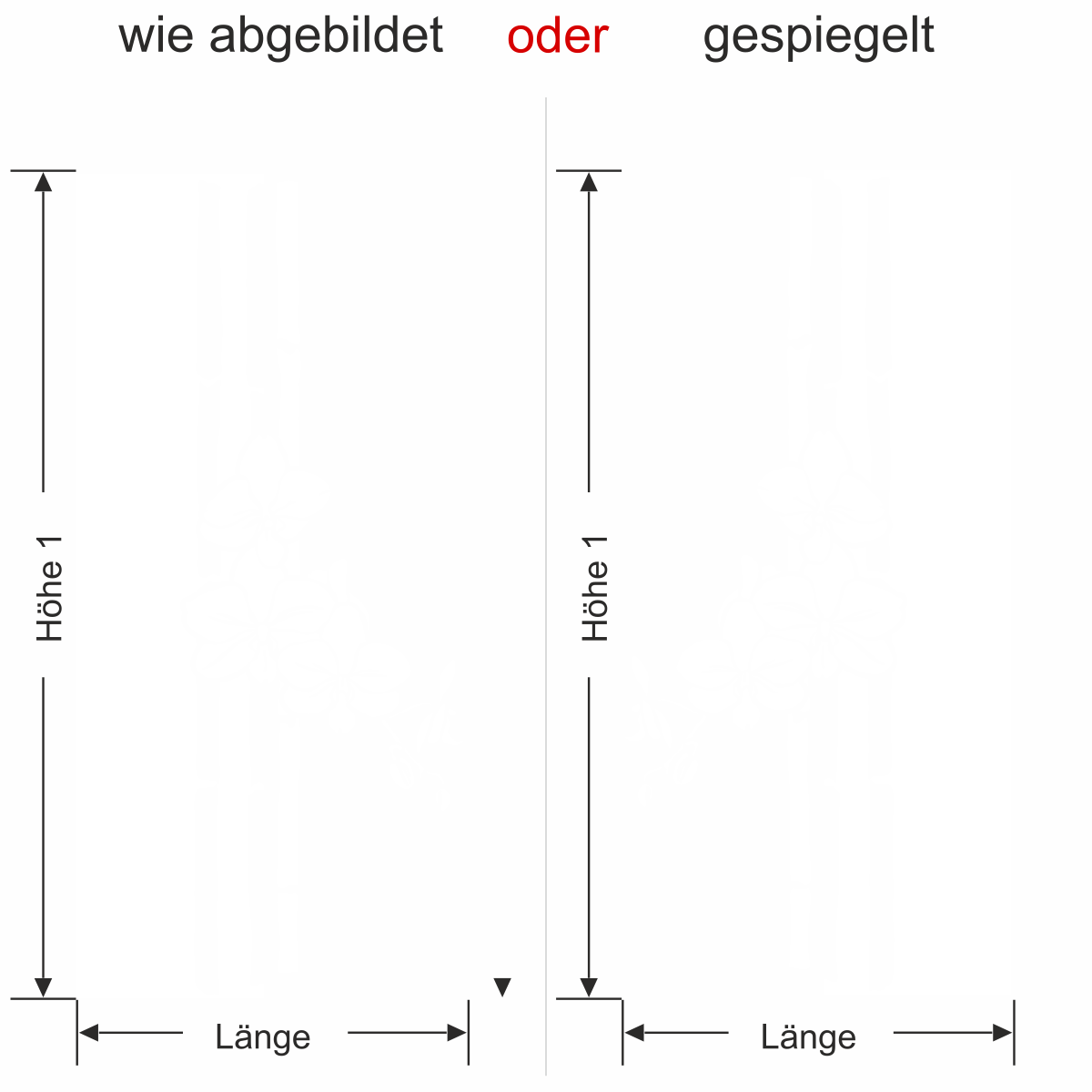 Objekt gespiegelt, Text wie abgebildet = Motiv/Text von außen geklebt und von außen lesbar, jedoch Motiv auf der anderen Seite