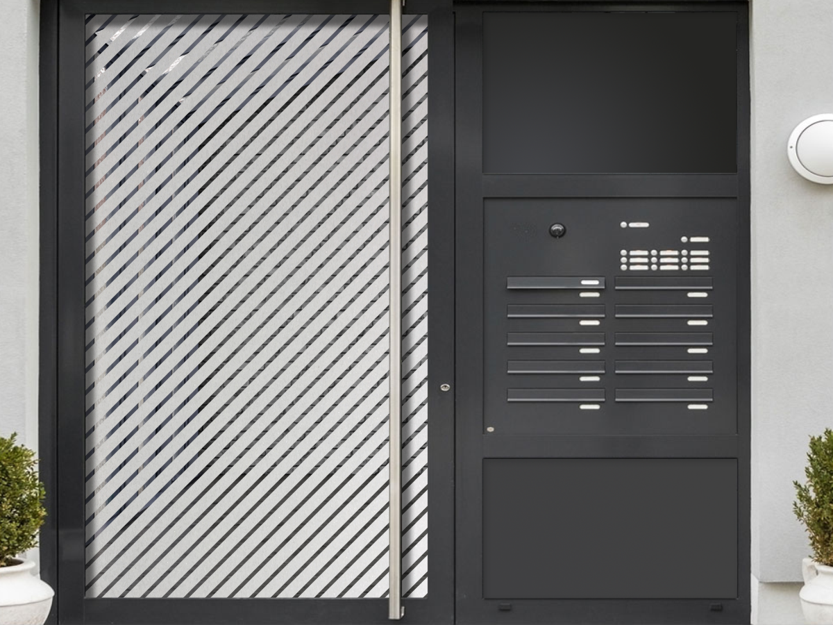 Glastür Milchglasfolie mit ca. 3 cm breiten schrägen Streifen und ca. 1 cm Abstand dazwischen