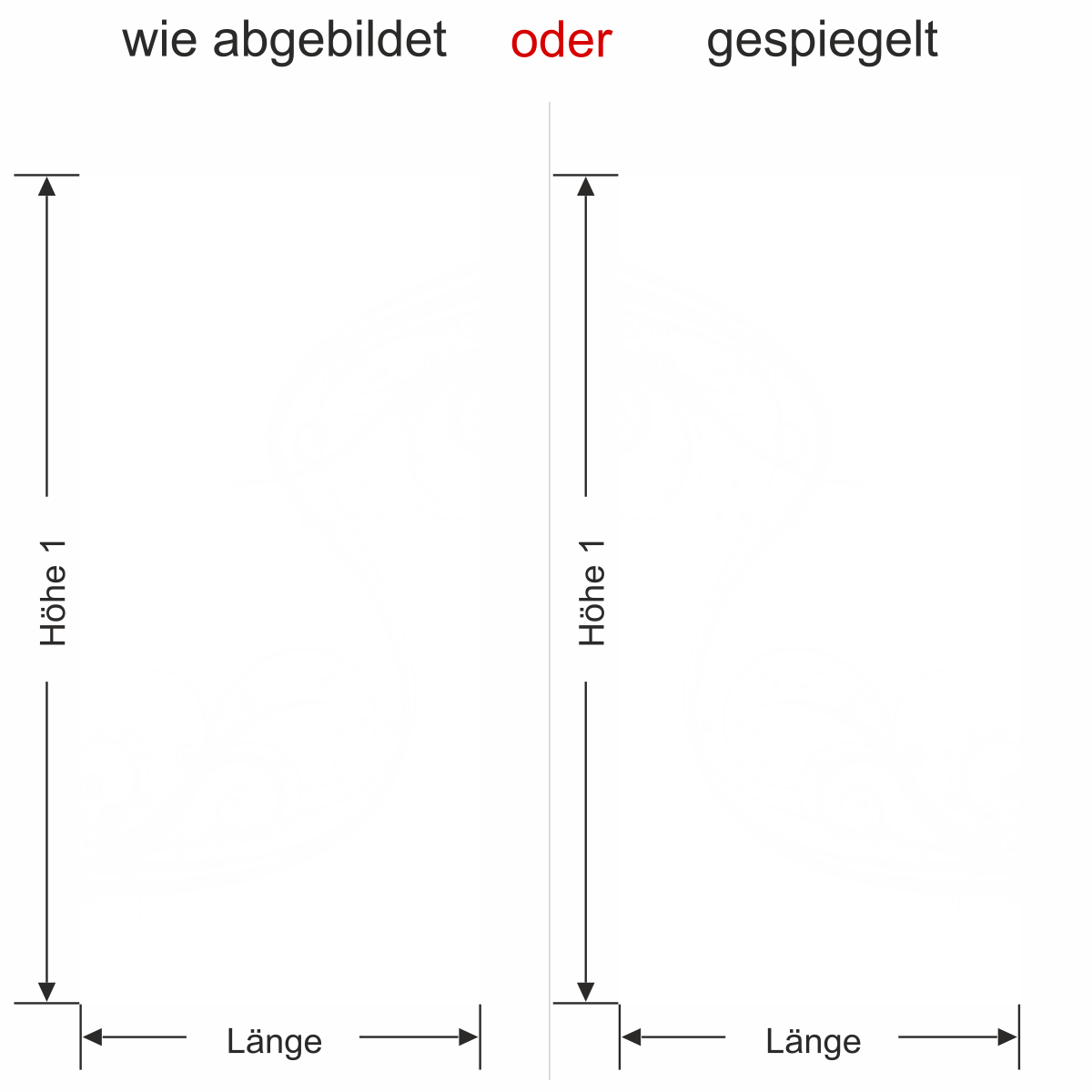 Objekt gespiegelt, Text wie abgebildet = Motiv/Text von außen geklebt und von außen lesbar, jedoch Motiv auf der anderen Seite