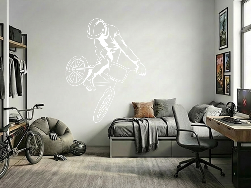 BMX Fans lieben den Staub der Rennstrecken und die dort lauernden Gefahren. Seit der Entstehung der BMX Räder in den 1980er Jahren ist der Sport bei kleinen und großen Radsportlern kaum mehr wegzudenken. Mit diesem energiegeladenen Wandsticker mit BMX Rad holen Sie sich das aufregende Gefühl von den Rennstrecken direkt ins Kinderzimmer oder Jugendzimmer. Verabschieden Sie sich von Ihren tristen Wänden und tauchen Sie ein in ein völlig neues Wohngefühl, dass Sie dieser tollen Gestaltungsidee von lifestyle-decor.de zu verdanken haben. Probieren Sie es aus und Sie werden absolut begeistert sein.