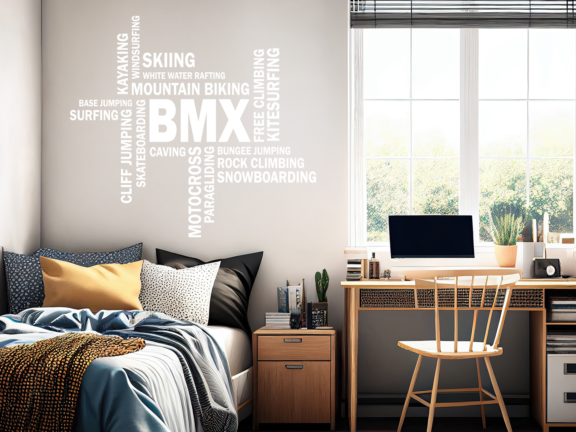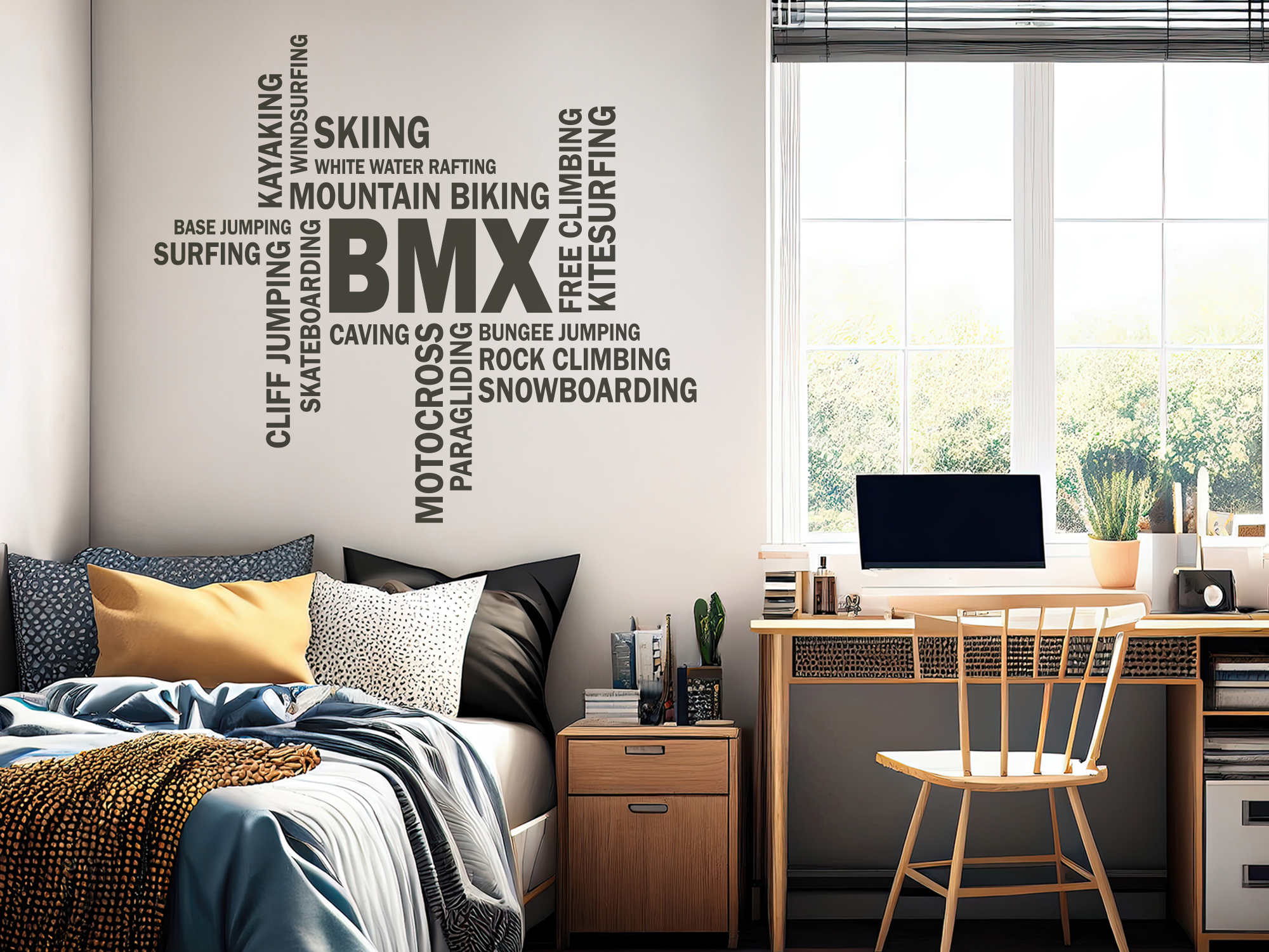 Solch ein stylisches Wandtattoo kann nicht nur ein Jugendzimmer optisch aufwerten, sondern beispielsweise auch im heimischen Fitnessraum eine gute Figur machen. Zeigen Sie der Welt mit diesen sportlichen Wandworten Ihre Vorliebe für actiongeladene Freizeitaktivitäten und bringen Sie damit neuen Schwung in Ihr privates Reich. Verschönern Sie Ihre Wände im Handumdrehen mit diesem tollen Wanddesign mit Begriffen wie Base Jumping, Surfing oder Kayaking und lassen Sie sich bereits in Ihrem Zuhause für die kommenden Aktivitäten inspirieren.