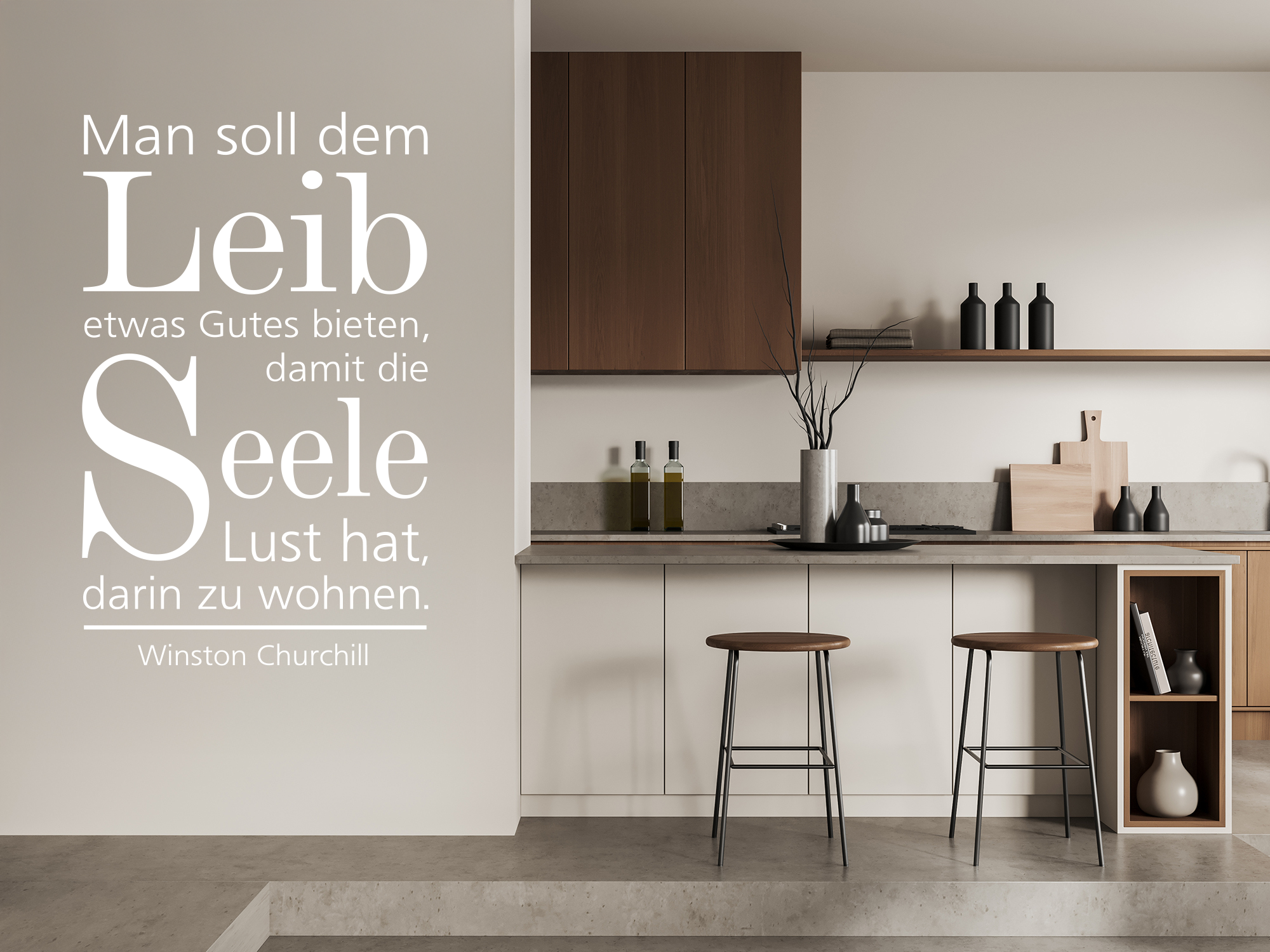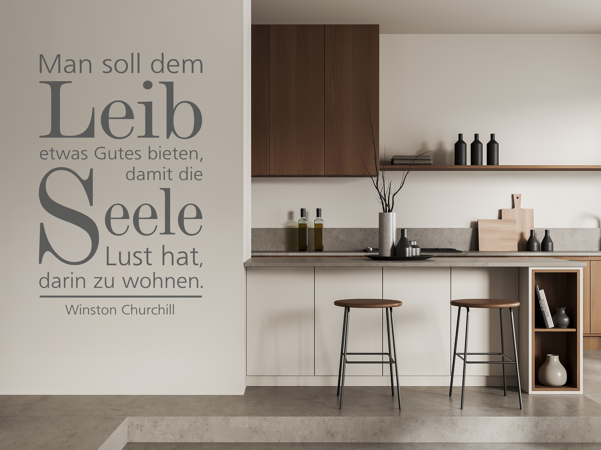 Das Zitat „Man soll dem Leib etwas Gutes bieten, damit die Seele Lust hat, darin zu wohnen“ von Winston Churchill als Wandtattoo findet in jeder modernen Küche seinen Platz. Holen Sie sich die Weisheit des berühmten britischen Staatsmanns nach Hause und dekorieren Sie eine einfache Wand damit auf extravaganter Weise. Der sogar mit dem Nobelpreis für Literatur ausgezeichnete Brite regt mit diesem Spruch als Wandsticker für die Küche zum ausgiebigen Kochen und Genießen an. Lassen auch Sie sich von diesem Wandzitat zu Höchstleistungen anspornen und stellen Sie leckere Gerichte her, die es im Kreise der Freunde und Familie zu verzehren gilt. Mit diesem Wandzitat hebt sich jede Stimmung in der Küche oder dem Esszimmer.