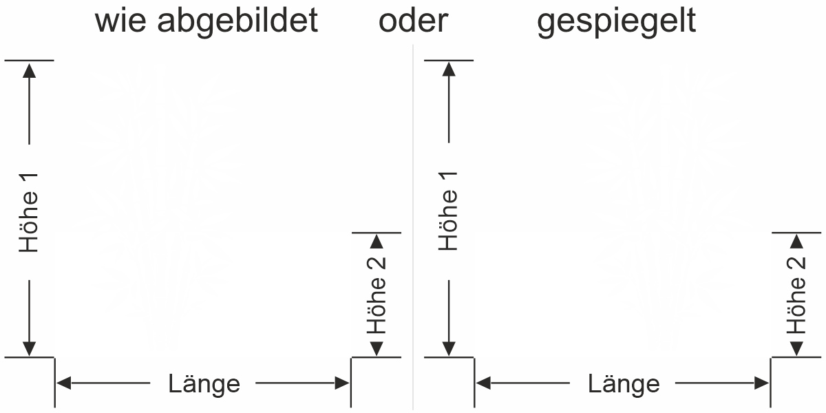 Wenn Sie einen Sichtschutz über Ihre gesamte Fläche benötigen, bitte bei Höhe 1 und Höhe 2 das gleiche Maß eingeben.
