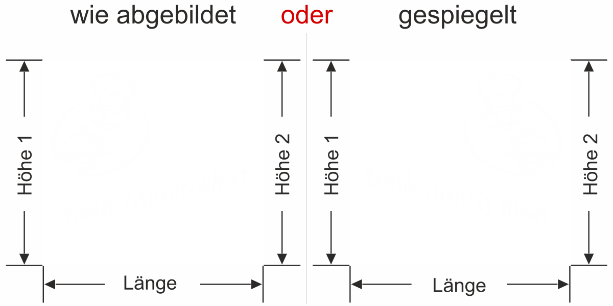 Objekt gespiegelt, Text wie abgebildet = Motiv/Text von außen geklebt und von außen lesbar, jedoch Motiv auf der anderen Seite