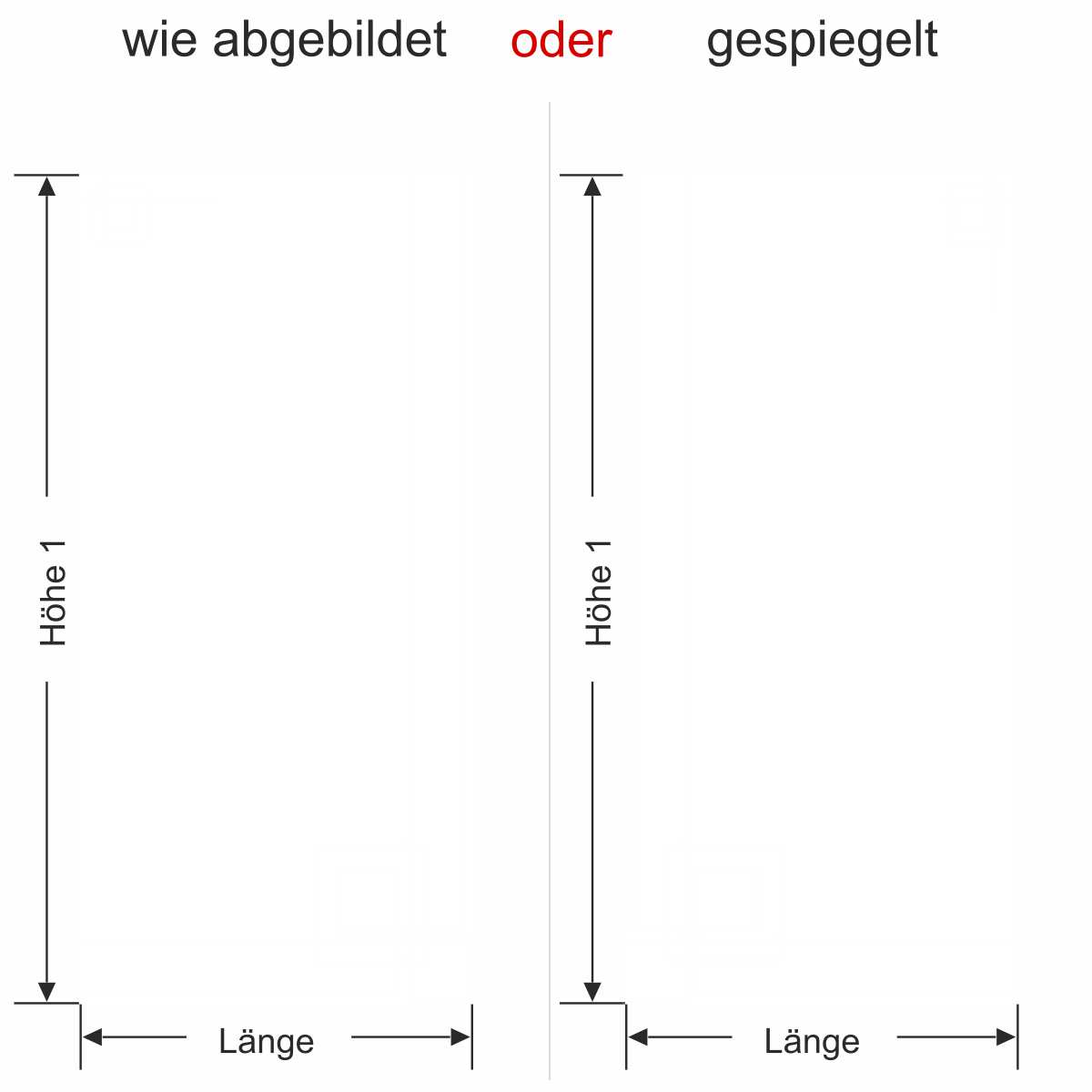 Objekt gespiegelt, Text wie abgebildet = Motiv/Text von außen geklebt und von außen lesbar, jedoch Motiv auf der anderen Seite