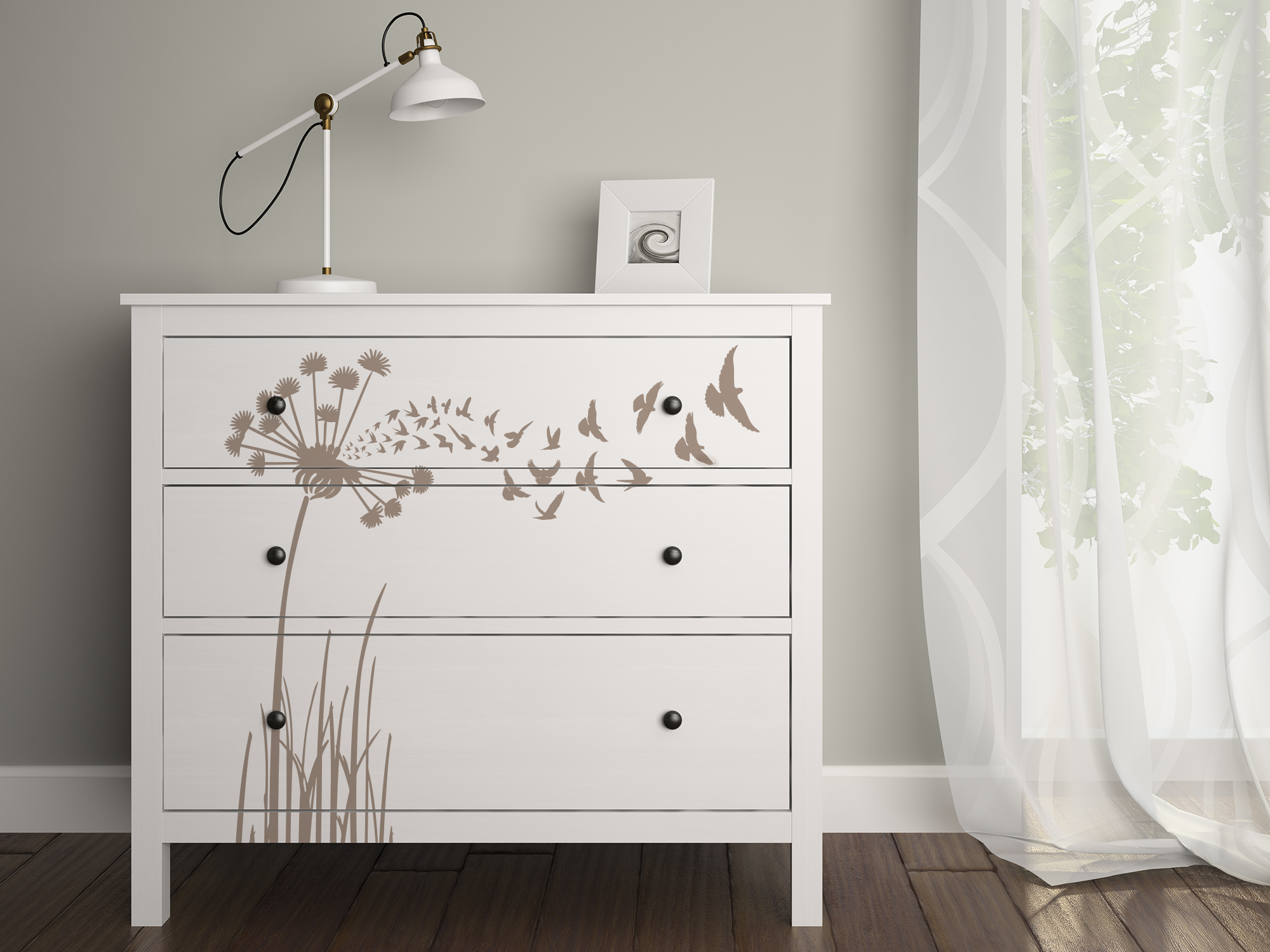 Schickes Möbeltattoo mit Vogelschwarm aus Löwenzahn