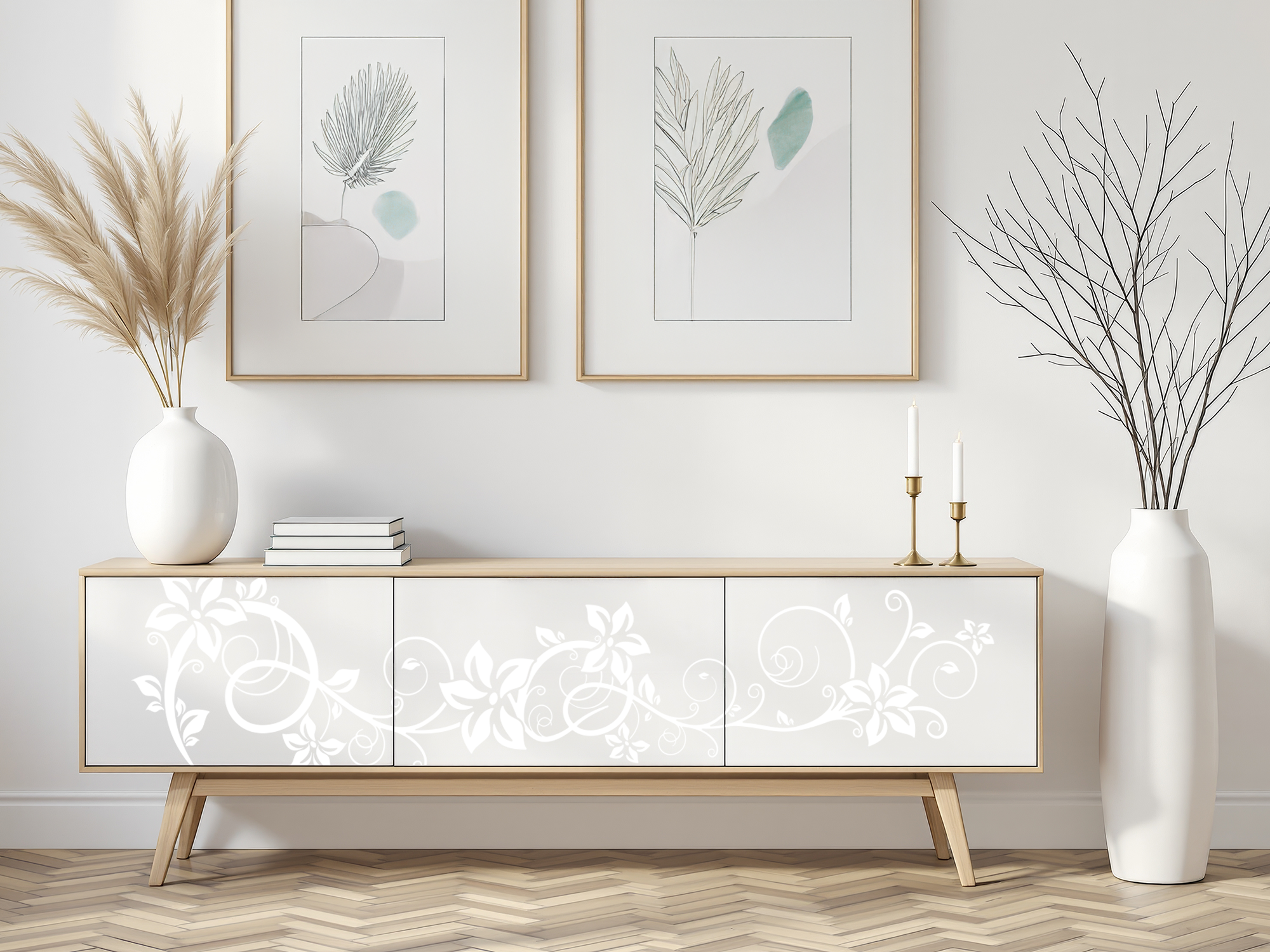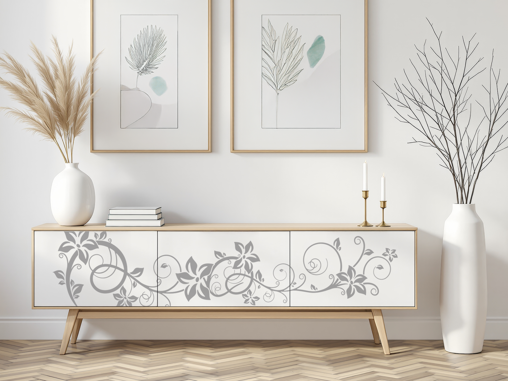Der Möbelaufkleber mit stilvoller Rankenpracht bietet Ihnen verschiedene Möglichkeiten bei der Wohnraumgestaltung. Setzen Sie das Rankenornament an exponierter Stelle als Hingucker ein oder verschönern Sie mit dem Möbeltattoo gleich mehrere Schränke oder Kommoden gleichzeitig: Kleben Sie den Möbelaufkleber über den Rand eines Möbelstücks und schneiden Sie den Aufkleber an der Kante ab. Den restlichen Aufkleber bringen Sie an ein weiteres Möbelstück an. So verleihen Sie dem gesamten Wohnraum ein einheitliches Erscheinungsbild. Mit keiner anderen Dekorationsidee können Sie Ihre Möbel derart individuell gestalten.