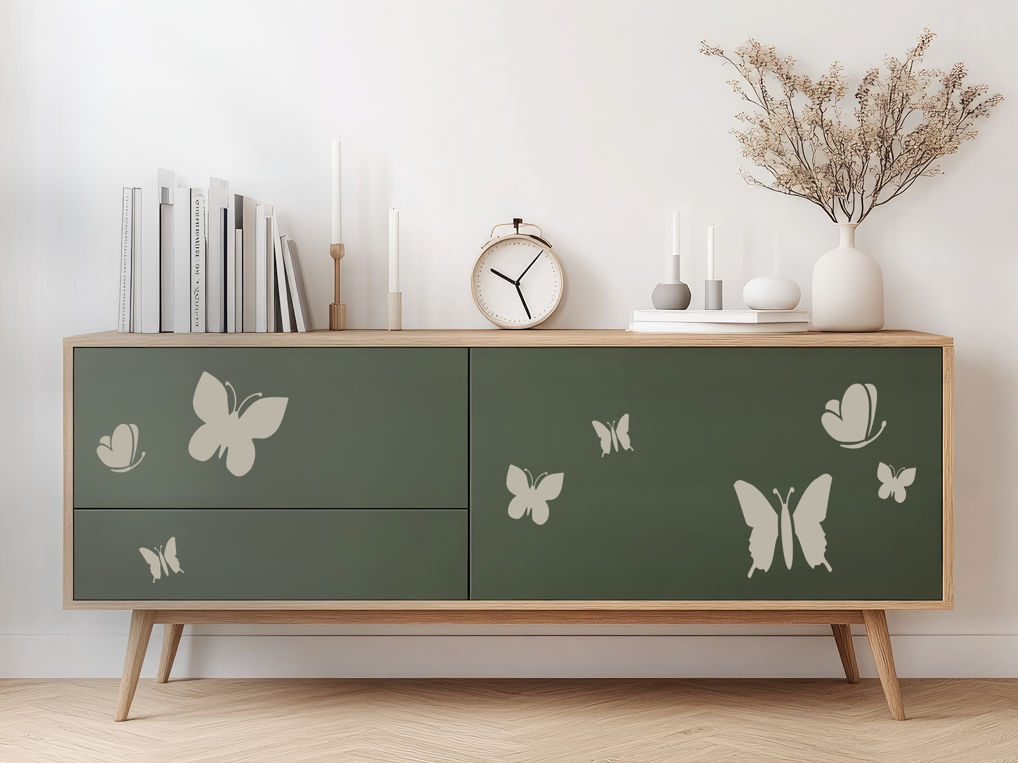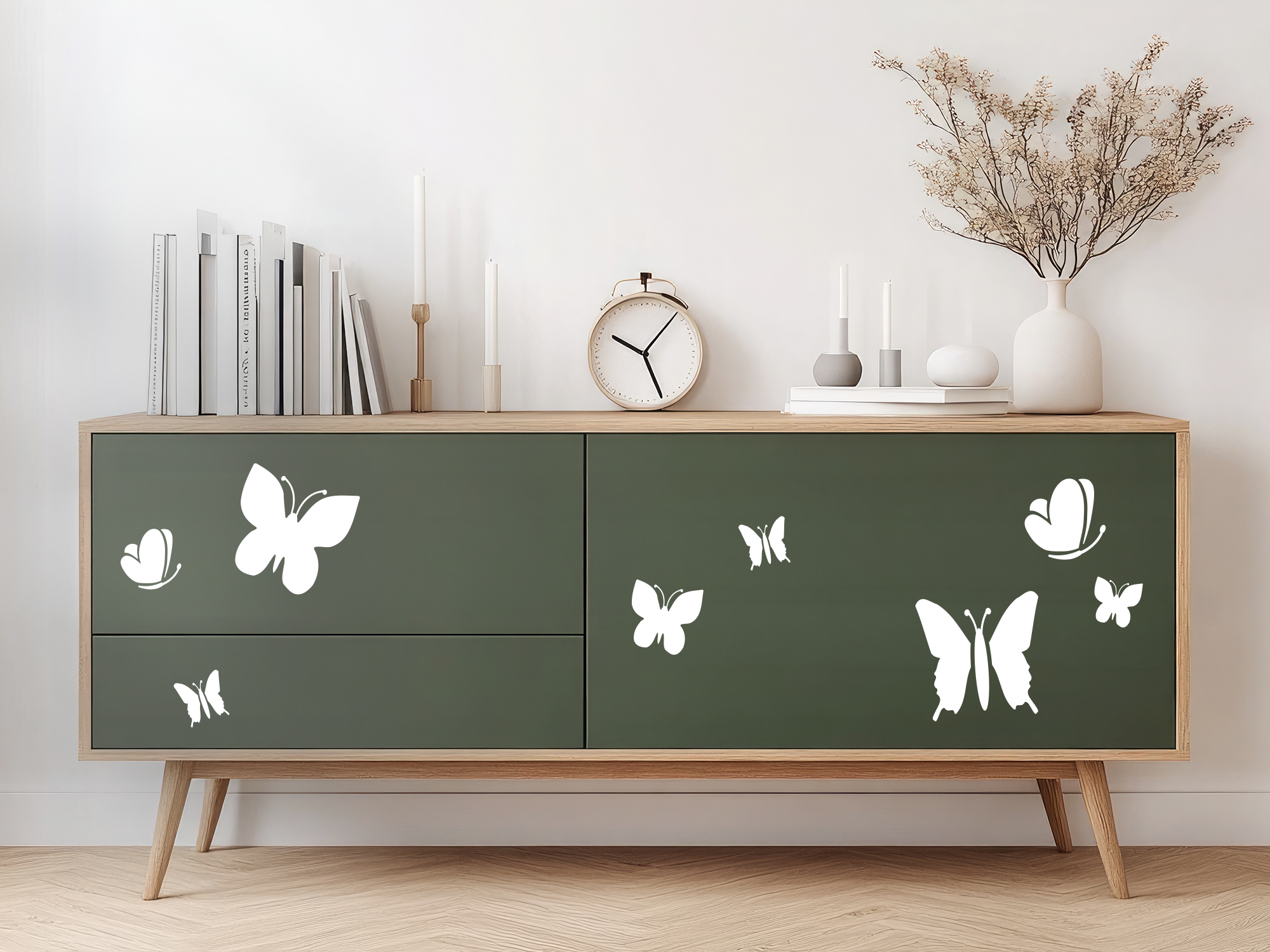 Verzaubern Sie Ihre Möbel mit diesen traumhaften Schmetterlingen als Möbeldekor. Damit zieht der Frühling während des gesamten Jahres bei Ihnen ein. Schmetterlinge als Schrankaufkleber sind nicht nur in Kinderzimmern oder Jugendzimmern geeignet. Auch im Bad, in der Küche oder dem Schlafzimmer können diese überaus beliebten Tiere eine einzigartige Stimmung entstehen lassen. Überzeugen Sie sich selbst von der einzigartigen Wirkung des Möbelstickers mit Schmetterlingen, indem Sie das Motiv an einer exponierten Stelle in einem Raum befestigen. Lassen Sie Ihrer Kreativität freien Lauf und erkunden Sie die weite Welt der stilvollen Dekoration.