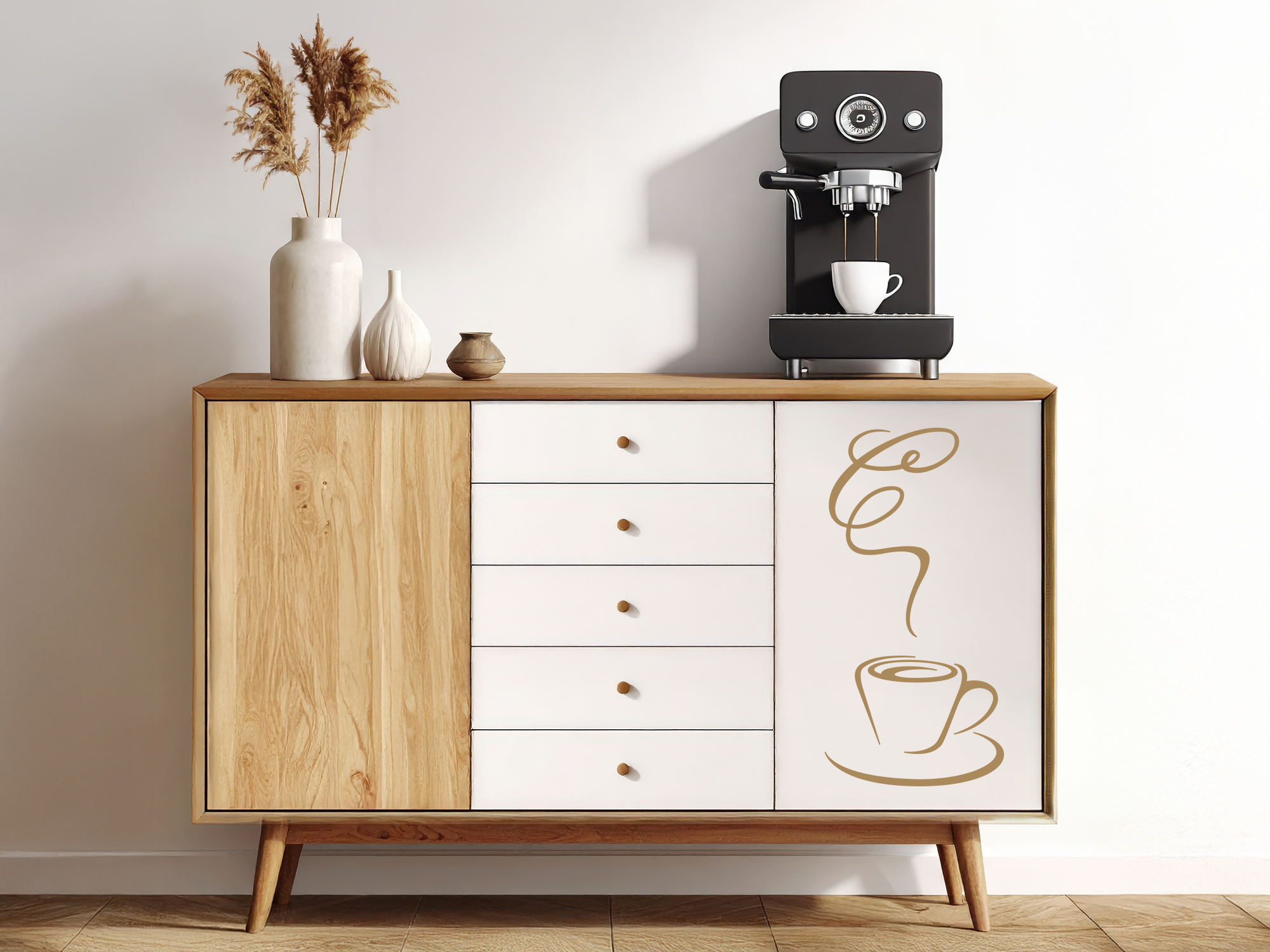Um Ihre Küche stilvoll zu gestalten, gibt es viele Möglichkeiten. Sie können zum Beispiel Ihre Schränke mit diesem oder anderen tollen Möbeltattoos verschönern. So lassen sich sehr schöne Akzente setzen und alte Möbel erscheinen in neuem Glanz. Für jeden Geschmack gibt es das passende Motiv, um Ihr Zuhause stilvoll zu dekorieren. Im Allgemeinen trinken ca. 86 Prozent der Deutschen täglich oder zumindest mehrmals wöchentlich Kaffee. Somit passt dieses elegante Motiv in nahezu jede Küche des Landes. Besonders in Kombination mit unseren Wandtattoos für Küche und Essbereich lässt sich die Optik Ihrer 4 Wände im Handumdrehen verschönern. Farblich aufeinander abgestimmt schaffen die Sticker ein tolles Ambiente.