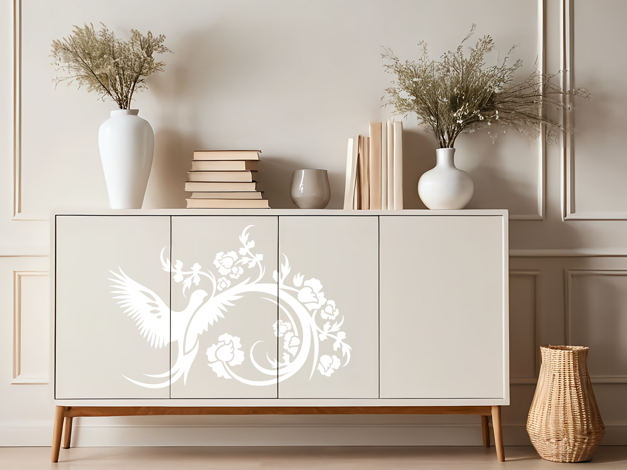 „Wenn du die Absicht hast, dich zu erneuern, tu es jeden Tag.“ Diesem Hinweis des chinesischen Philosophen Konfuzius kann mit dem Zauberornament als Möbeldekor nachgegangen werden. Denn noch nie war die Umgestaltung von Wohnräumen so einfach! Mit wenigen Handgriffen kann die seidenmatte, selbstklebende Folie an einem Schrank montiert bzw. demontiert werden. Somit können Sie ganz nach Belieben den eigenen Wohnraum ständig neu interpretieren. Soll in Ihrem Schlafzimmer oder Bad die Ruhe und Erhabenheit des Fernen Ostens Einzug halten, so kann das Zauberornament als Schrankaufkleber bei der schnellen Realisierung diesen Wohntraums helfen.