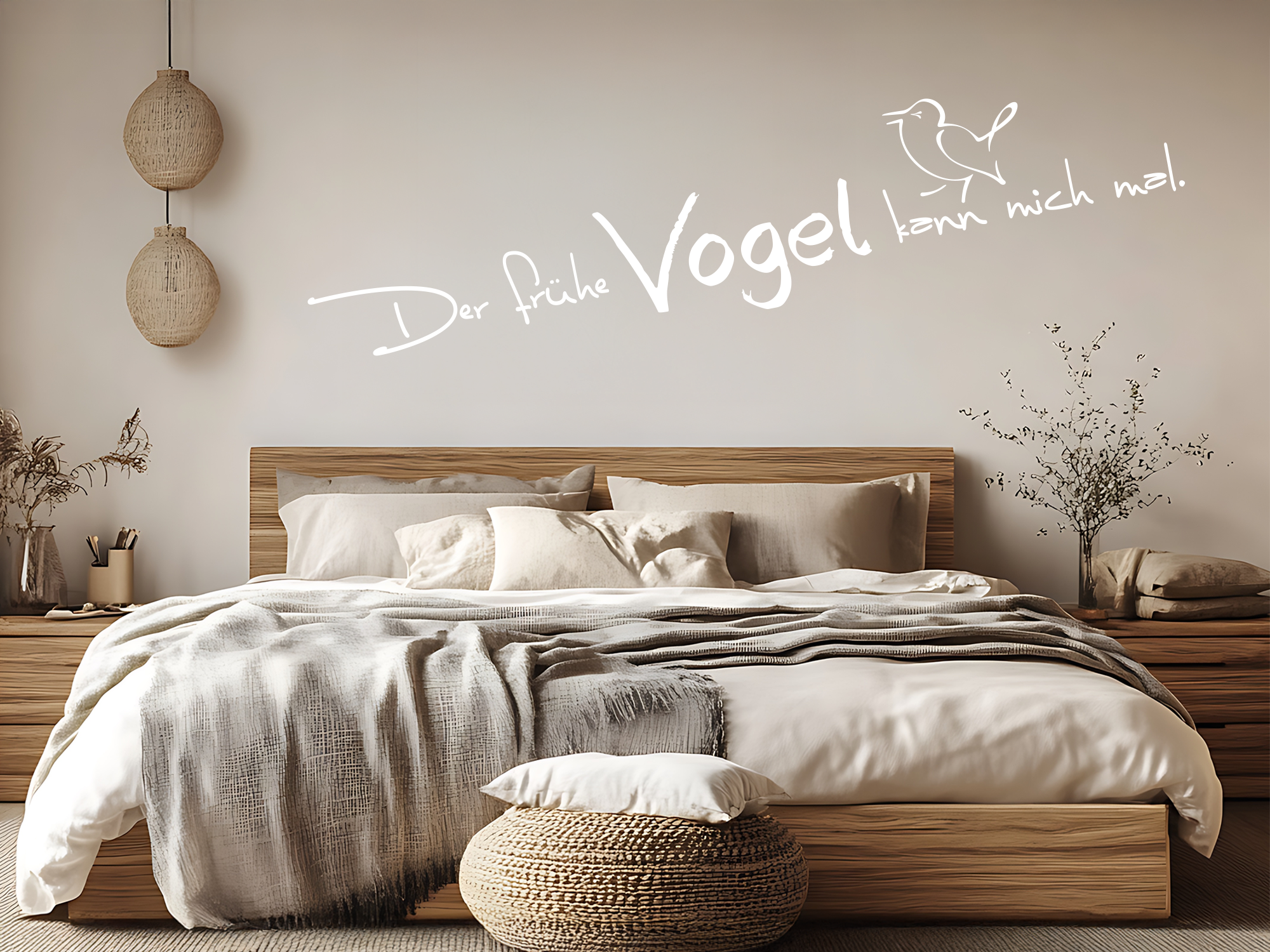Auch wenn unsere Augen im Schlafzimmer meist geschlossen sind, ist eine schöne Wandgestaltung und Dekoration sehr wichtig für unser Wohlbefinden und eine gute Wohnatmosphäre. Für einen gemütlichen Schlafbereich sind gerade weiche Farbtöne sehr geeignet. Grelle Farben hingegen wirken sehr unruhig und stören die Harmonie. Dieses lustige Wandtattoo ist in zwei unterschiedlichen Varianten erhältlich: "Der frühe Vogel kann mich mal" und "Der frühe Vogel kann uns mal." Wählen Sie Ihre persönliche Kombination aus Farbe und Variante und verschönern Sie Ihre Wände mit diesem tollen Wandspruch.