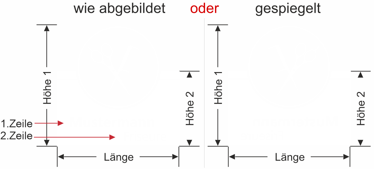Objekt gespiegelt, Text wie abgebildet = Motiv/Text von außen geklebt und von außen lesbar, jedoch Motiv auf der anderen Seite