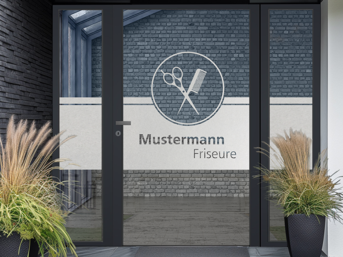 Fensterfolie mit Friseurlogo und Wunschtexteingabe