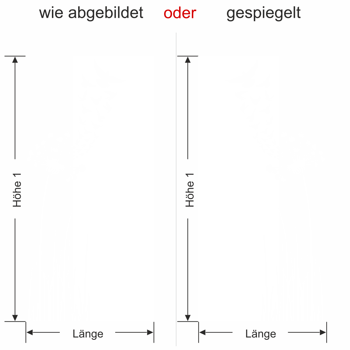 Objekt gespiegelt, Text wie abgebildet = Motiv/Text von außen geklebt und von außen lesbar, jedoch Motiv auf der anderen Seite