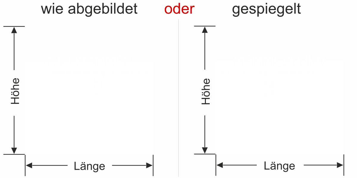 Objekt gespiegelt, Text wie abgebildet = Motiv/Text von außen geklebt und von außen lesbar, jedoch Motiv auf der anderen Seite