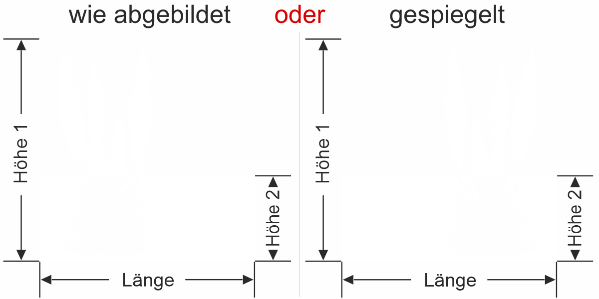 Wenn Sie einen Sichtschutz über Ihre gesamte Fläche benötigen, bitte bei Höhe 1 und Höhe 2 das gleiche Maß eingeben.
