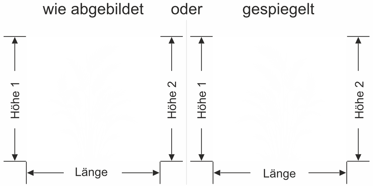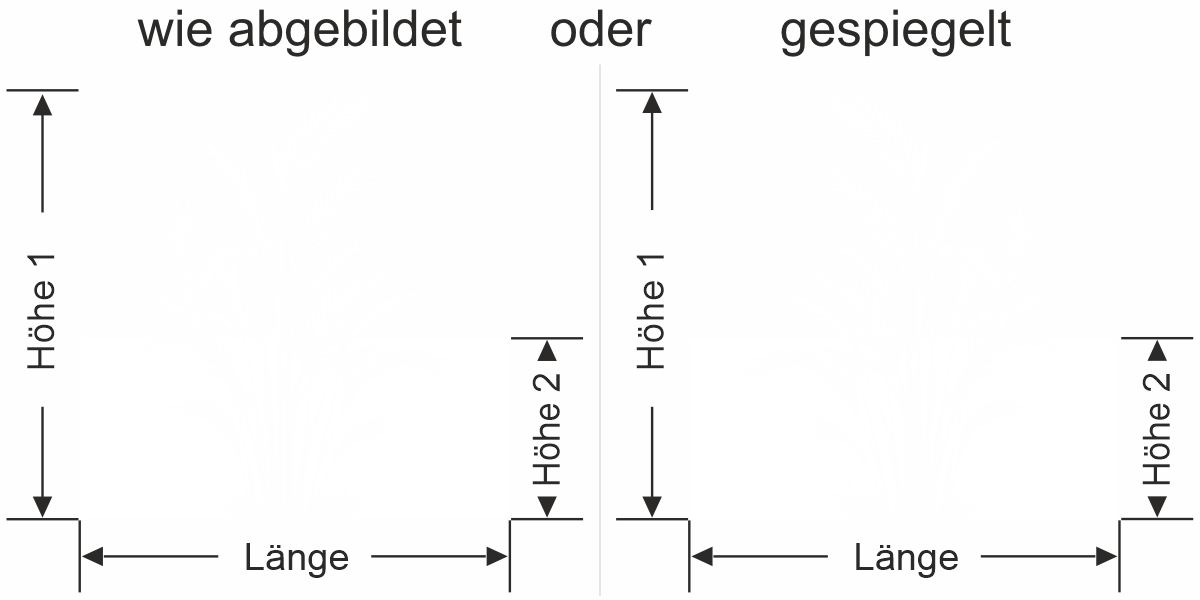 Wenn Sie einen Sichtschutz über Ihre gesamte Fläche benötigen, bitte bei Höhe 1 und Höhe 2 das gleiche Maß eingeben.