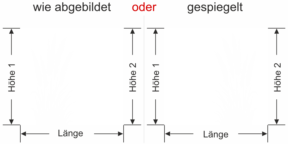 Wenn Sie einen Sichtschutz über Ihre gesamte Fläche benötigen, bitte bei Höhe 1 und Höhe 2 das gleiche Maß eingeben.