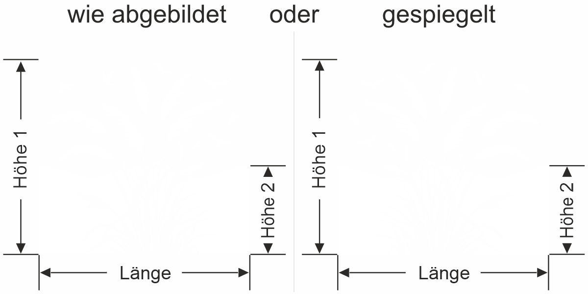 Wenn Sie einen Sichtschutz über Ihre gesamte Fläche benötigen, bitte bei Höhe 1 und Höhe 2 das gleiche Maß eingeben.