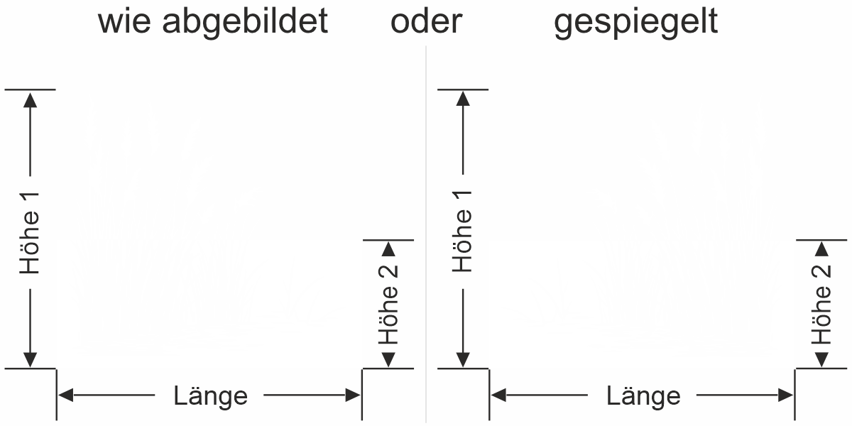 Wenn Sie einen Sichtschutz über Ihre gesamte Fläche benötigen, bitte bei Höhe 1 und Höhe 2 das gleiche Maß eingeben.