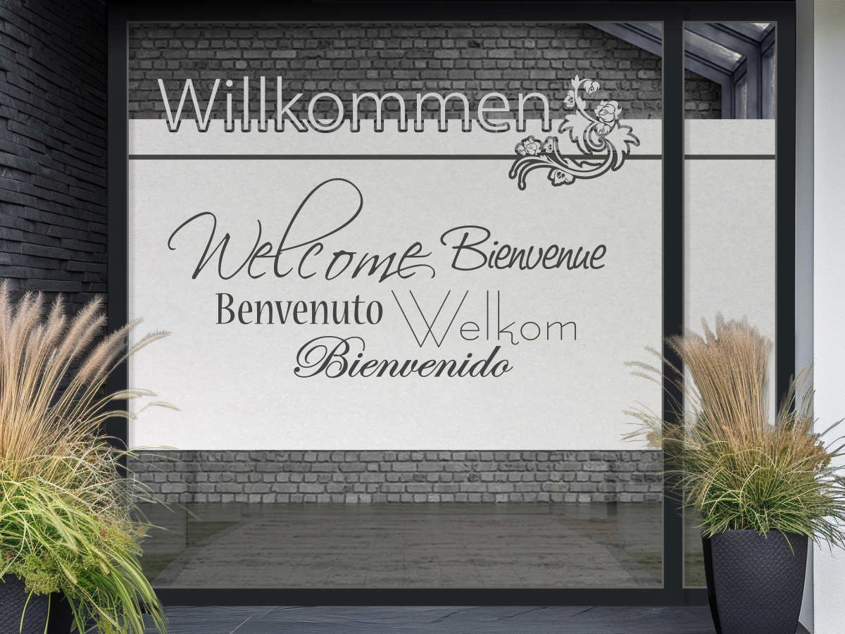 Passgenaue Sichtschutzfolie mit dem Wort Willkommen in vielen Sprachen