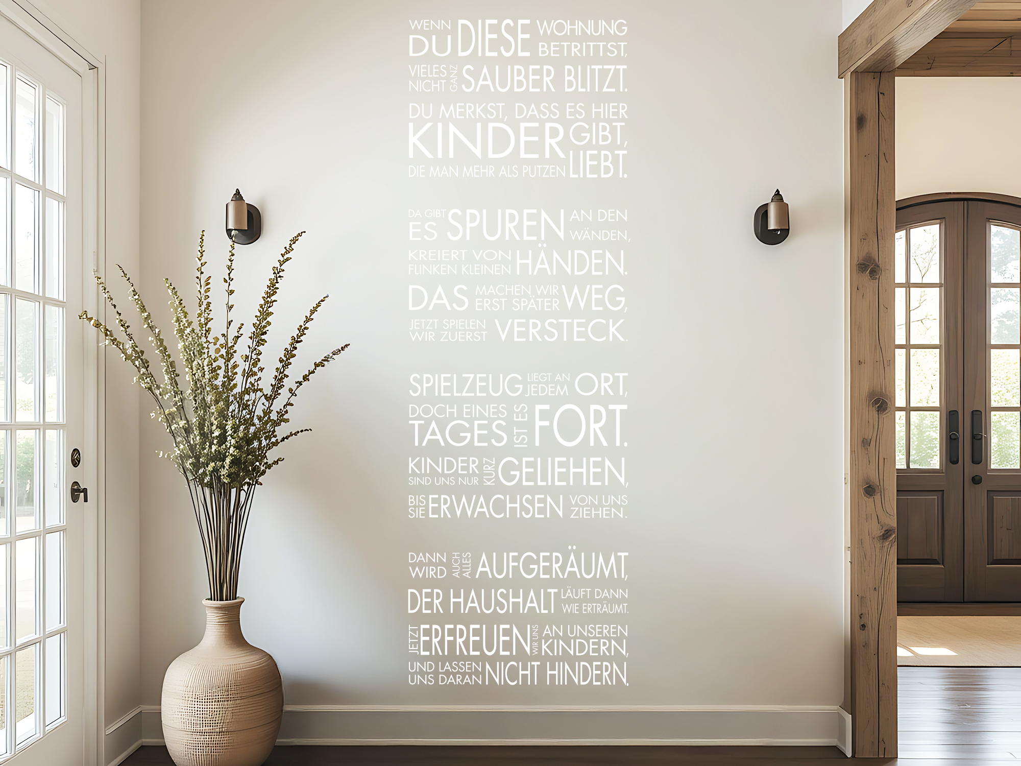 Wenn du diese Wohnung betrittst, vieles nicht ganz sauber blitzt. Du merkst, dass es hier Kinder gibt, die man mehr als putzen liebt. Da gibt es Spuren an den Wänden, kreiert von kleinen flinken Händen. Das machen wir erst später weg, jetzt spielen wir zuerst Versteck. Spielzeug liegt an jedem Ort, doch eines Tages ist es fort. Kinder sind uns nur kurz geliehen, bis sie erwachsen von uns ziehen. Dann wird auch alles aufgeräumt, der Haushalt läuft dann wie erträumt. Jetzt erfreuen wir uns an unseren Kindern und lassen uns daran nicht hindern.