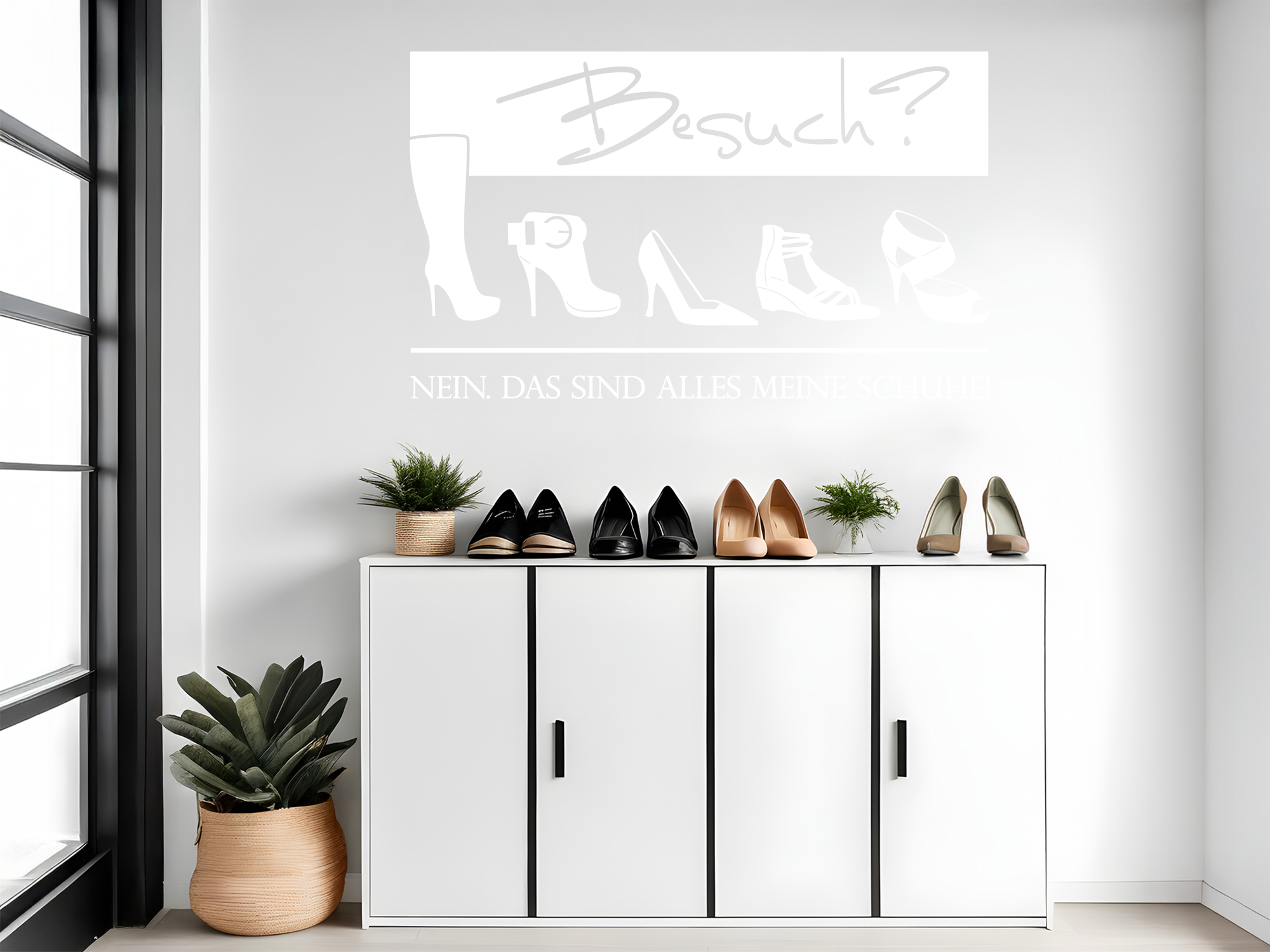Dieser witzige Wandspruch zaubert Ihnen jeden Tag aufs Neue ein Lächeln auf die Lippen und auch Ihr Besuch wird von so viel Einfallsreichtum begeistert sein. Bringen Sie das Wandtattoo mit „Besuch? Nein, das sind alles meine Schuhe“ im Ankleidezimmer oder dem Eingangsbereich an und schaffen Sie damit einen echten Hingucker. Das Wandtattoo lässt sich mit wenigen Handgriffen anbringen und ist damit selbst für Laien geeignet. Lassen Sie Ihrer Kreativität freien Lauf und verschönern Sie mit diesem Aufkleber für die Wand im Flur oder in einem anderen Zimmer das komplette Ambiente in Ihrem Zuhause.